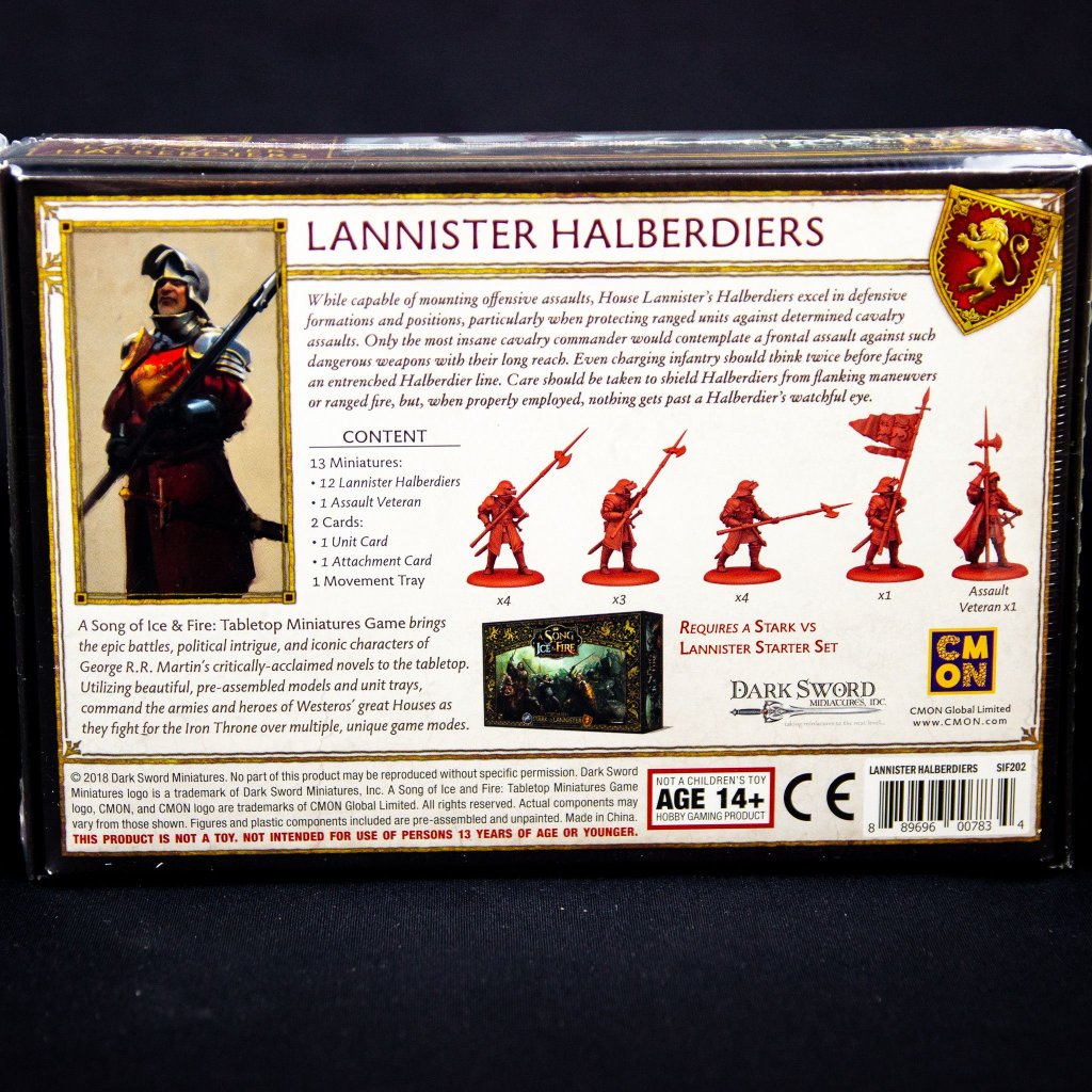 - Lannister Halberdiers přidává do hry 13 miniatur, z toho 12 Lannister Halbedies a 1 veterána.