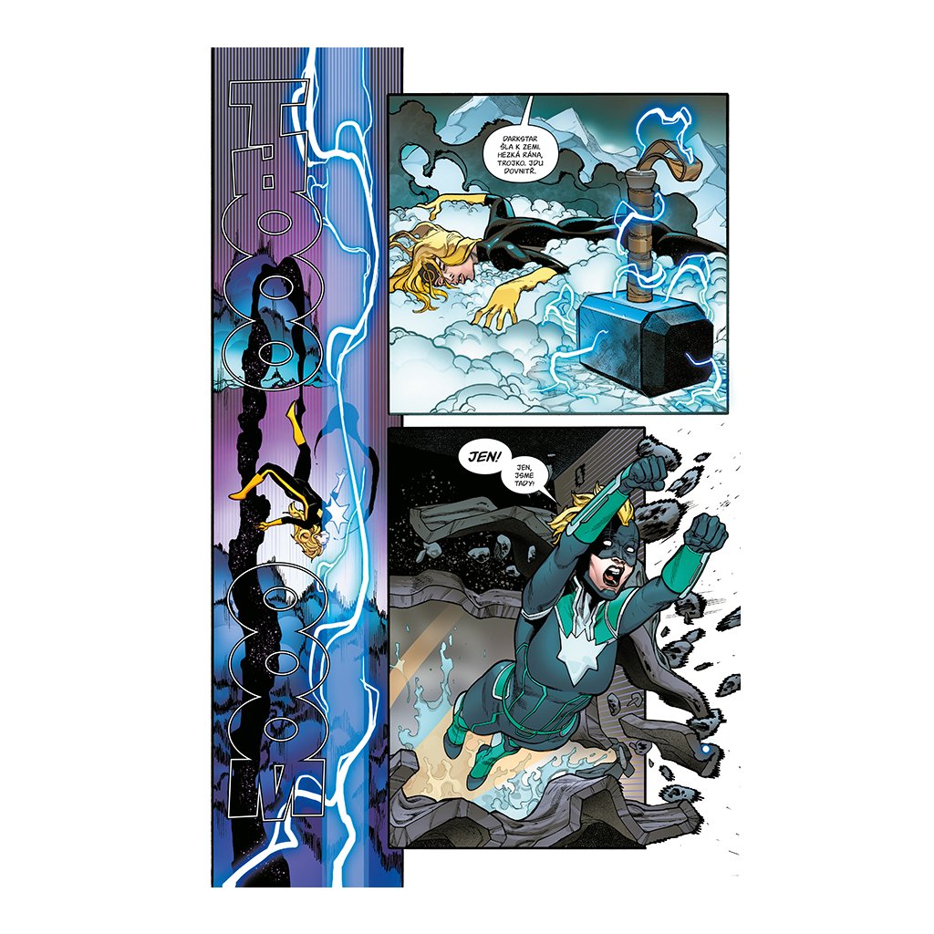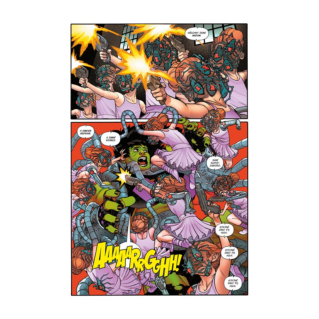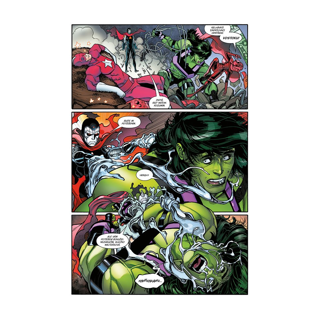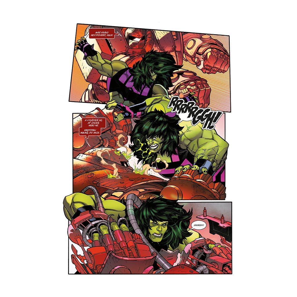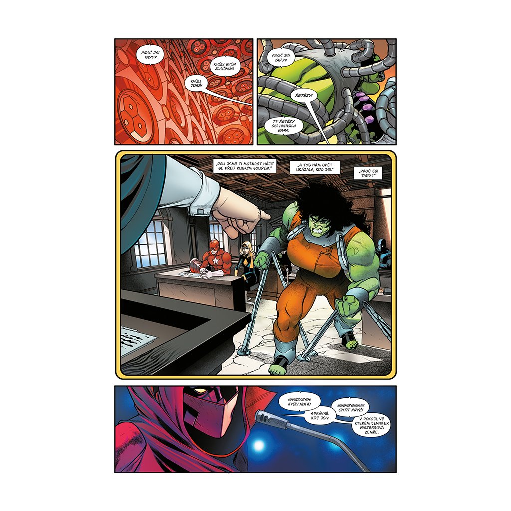 Planeta je roztříštěnější a nestálejší než kdy dřív. She-Hulk je prohlášena za celosvětovou hrozbu a nejmocnější hrdinové Ruska, Zimní hlídka, dostanou za úkol předvést ji před spravedlnost! Jen Waltersovou tak čeká osud příliš krutý i pro Hulky. Rudý pokoj, tajná výheň, ve které byli ukováni největší vrazi a monstrózní zabijáci, promění Jen v něco strašlivého. A kromě toho: oslavná taškařice s největší akcí a překvapením na Zemi! Dozvíte se skutečné poslání pravěkých Avengers a uvidíte, koho nově rekrutují. Vydáte se s Ghost Riderem na jeho mnohovesmírnou honbu za pomstou, která zažehne úplně novou éru dějin Avengers!