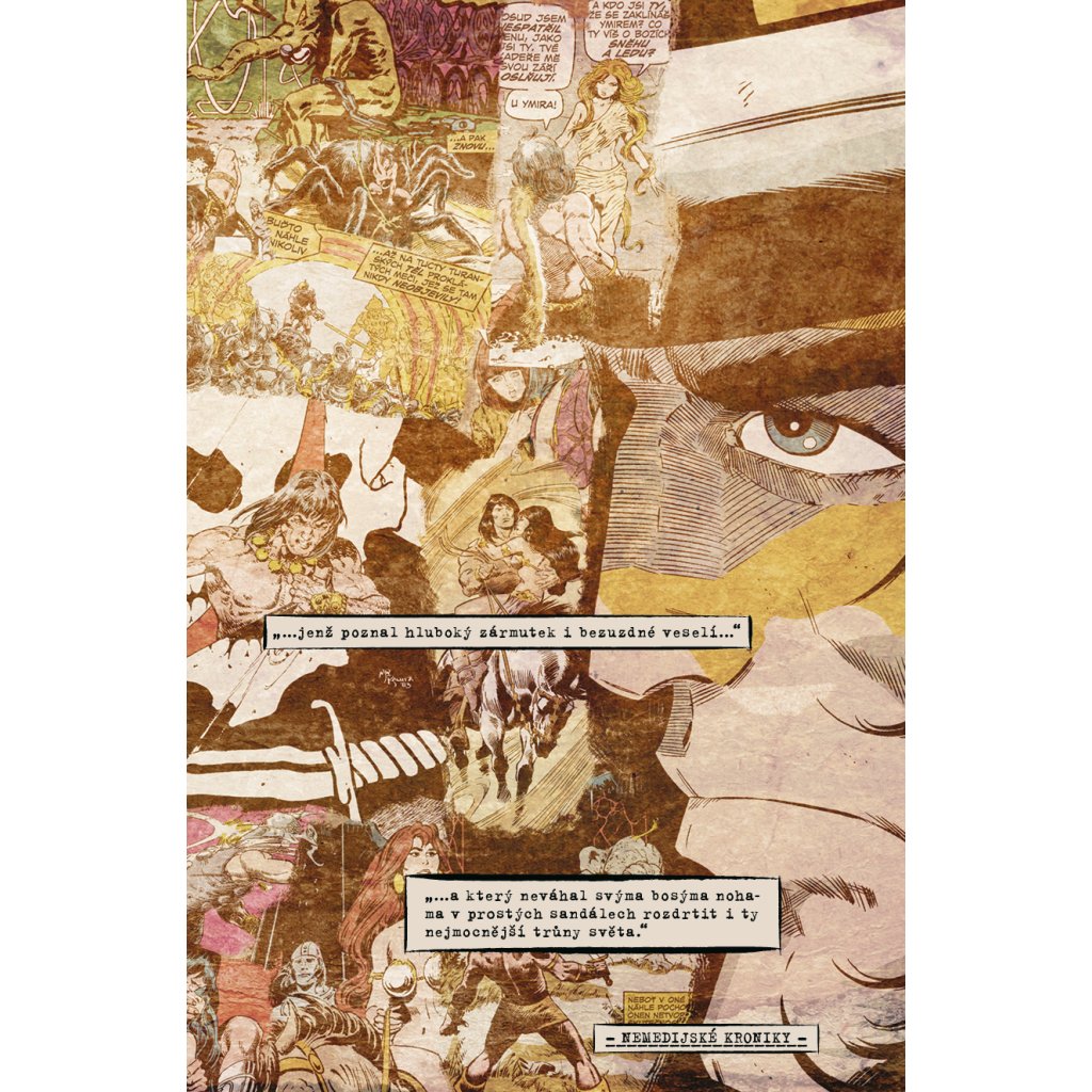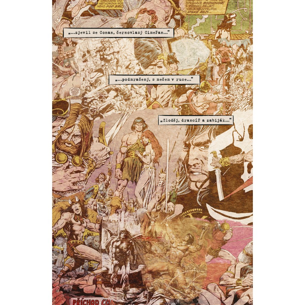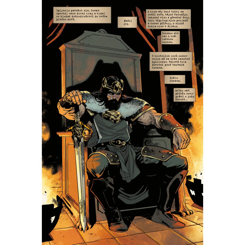 Z věku nepředstavitelných divů přichází... Conan, černovlasý Cimeřan, podmračený, s?mečem v?ruce. Zloděj, drancíř a zabiják, jenž poznal hluboký zármutek i bezuzdné veselí a který neváhal svýma bosýma nohama v?prostých sandálech rozdrtit i ty nejmocnější trůny světa. Conan došel při svém putování až k nejzazším okrajům známých světů: byl bojovníkem v Zamoře či zvědem v piktské divočině, od narození v Cimerii až k aquilonskému trůnu. Ačkoliv si svou cestu životem statečně proklestil pomocí bojových dovedností, bez ustání k sobě přitahoval pozornost temných sil! A bylo jich jen málo, které by byly záludnější nežli zlotřilá Karmínová čarodějka. Legendární barbar stvořený Robertem E. Howardem znovu ožívá ve zbrusu novém příběhu, jenž navždy změní osud válečníka Conana... a také krále Conana!