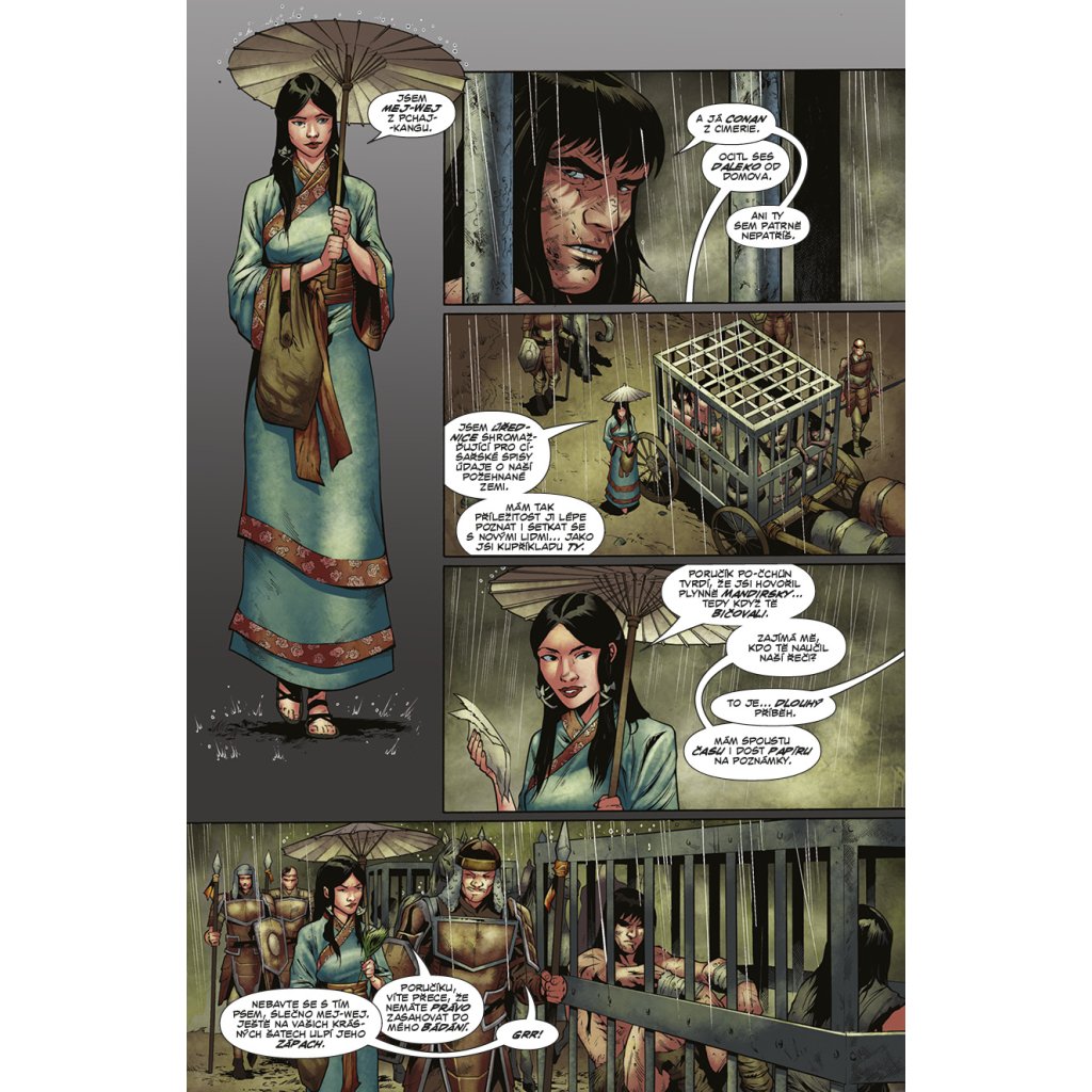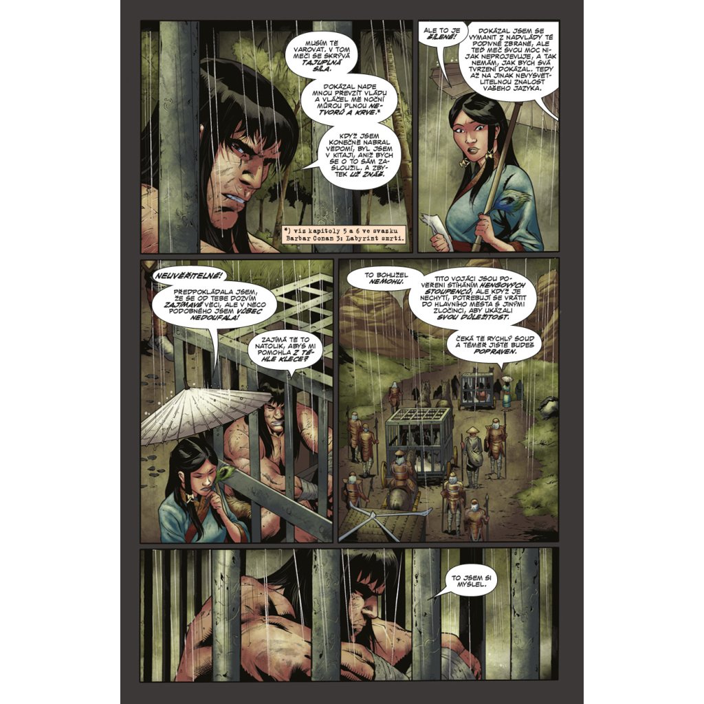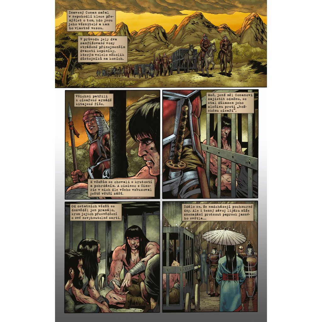 Po příchodu do Kitaje Conan skončil v poutech, avšak statečného barbara jen tak nějaké okovy nezastaví! Bleskurychle naplánuje útěk a získá nového spojence v půvabné císařské úřednici, avšak v zákoutích kitajské džungle číhá lítá zvěř i krvežízniví bandité. Podaří se Conanovi vrátit démonický meč jeho pravému majiteli, přežít pikle na císařském dvoře a v pořádku se vrátit domů? Knihu uzavírá jubilejní třístý sešit série Barbar Conan s třemi povídkami hostujících autorů.
