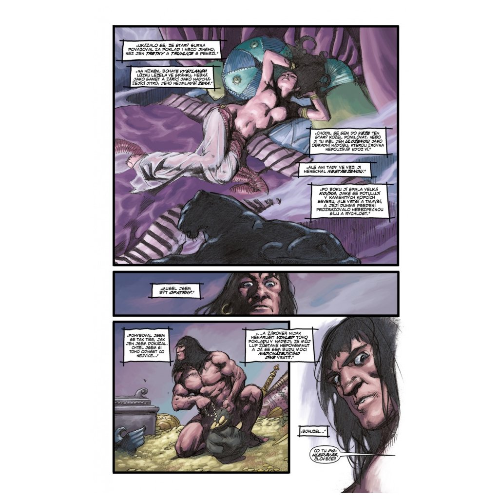 Conanova dobrodružství ve Městě zlodějů pokračují a vyprávění se ujímají tři z těch nejlepších komiksových scenáristů společně s výtvarníky Carym Nordem a Davem Stewartem. Vysílají neohroženého Cimeřana přímo do náruče Gundeřanových lučištníků i nebezpečných svůdkyň, stejně jako do nitra hrůzných rozvalin plných živoucích mrtvol a protivníků daleko příšernějších, než jaké kdy poznal. Kniha obsahuje poslední příběh Kurta Busieka a dále adaptaci jedné z legendárních Howardových „ztracených“ povídek „Síně mrtvých“, ve které Mike Mignola, tvůrce Hellboye, staví Conana proti bizarním netvorům v rozvalinách jednoho polozapomenutého města. A do třetice, opěvovaný kreslíř a legenda nezávislého komiksu Timothy Truman uvádí svou první conanovskou povídku o záludných mniších, šílených psech a pololidských přízracích z kopců, v níž bude rozdrcena nejedna lebka.