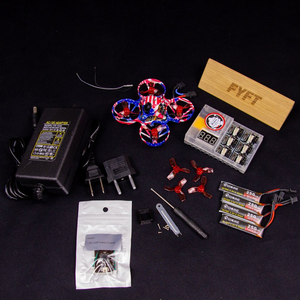 Na poslední fotce najdeš kompletní obsah balení drona Whoop DE65, jen je tam jiný dron.