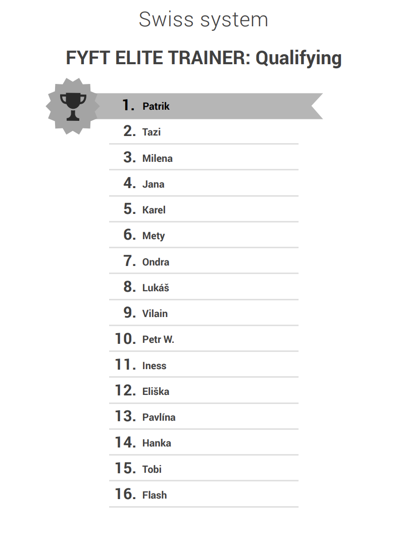 - SWISS - Počet zápasů se bude odvíjet od počtu hráčů, 4 až 5. Do dalšího zápasu dostaneš soupeře se stejným/podobným skóre.