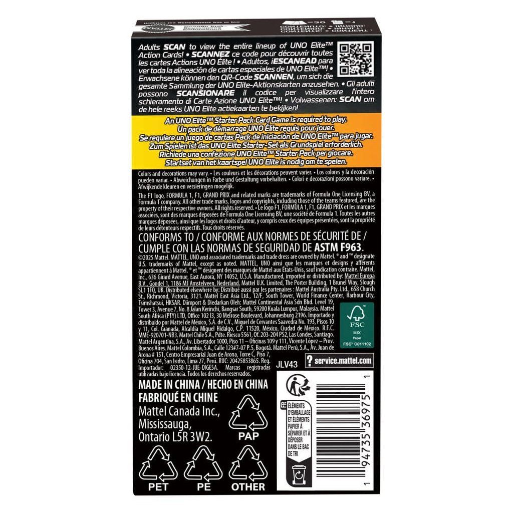 - Pozor: toto je rozšíření, nikoli startovací sada — ke hraní je nutná základní sada UNO Elite Formula 1 2025 Core Edition (prodávána samostatně).