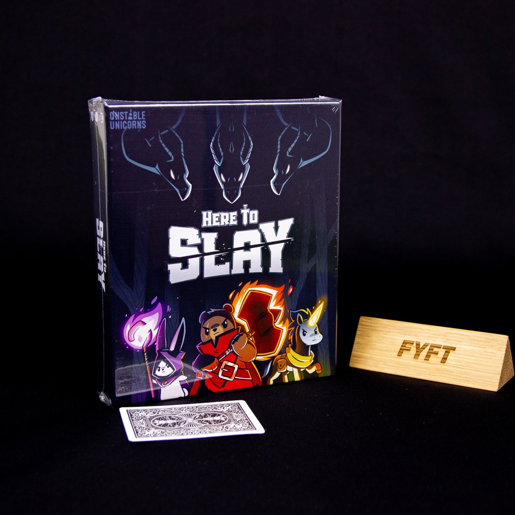 - Here to Slay je kompetitivní RPG fantasy karetní hra o o shromážďování hrdinů a zabíjení příšer.