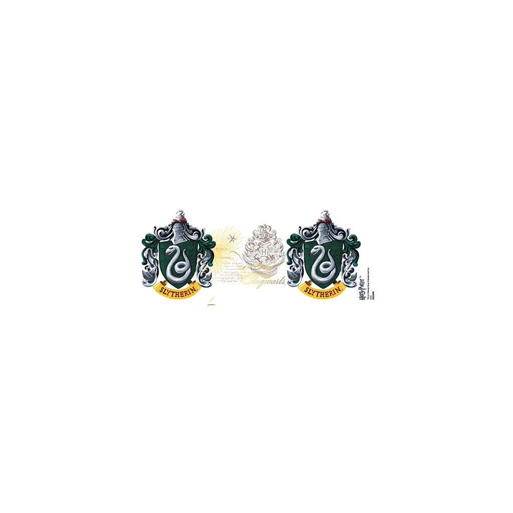 - Hrnek je opatřen erbem se stuhou Zmijozelu a spolu s erbem Bradavic.