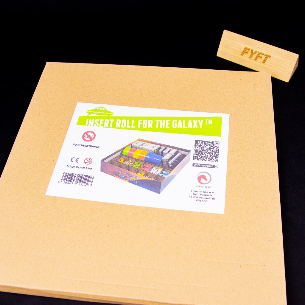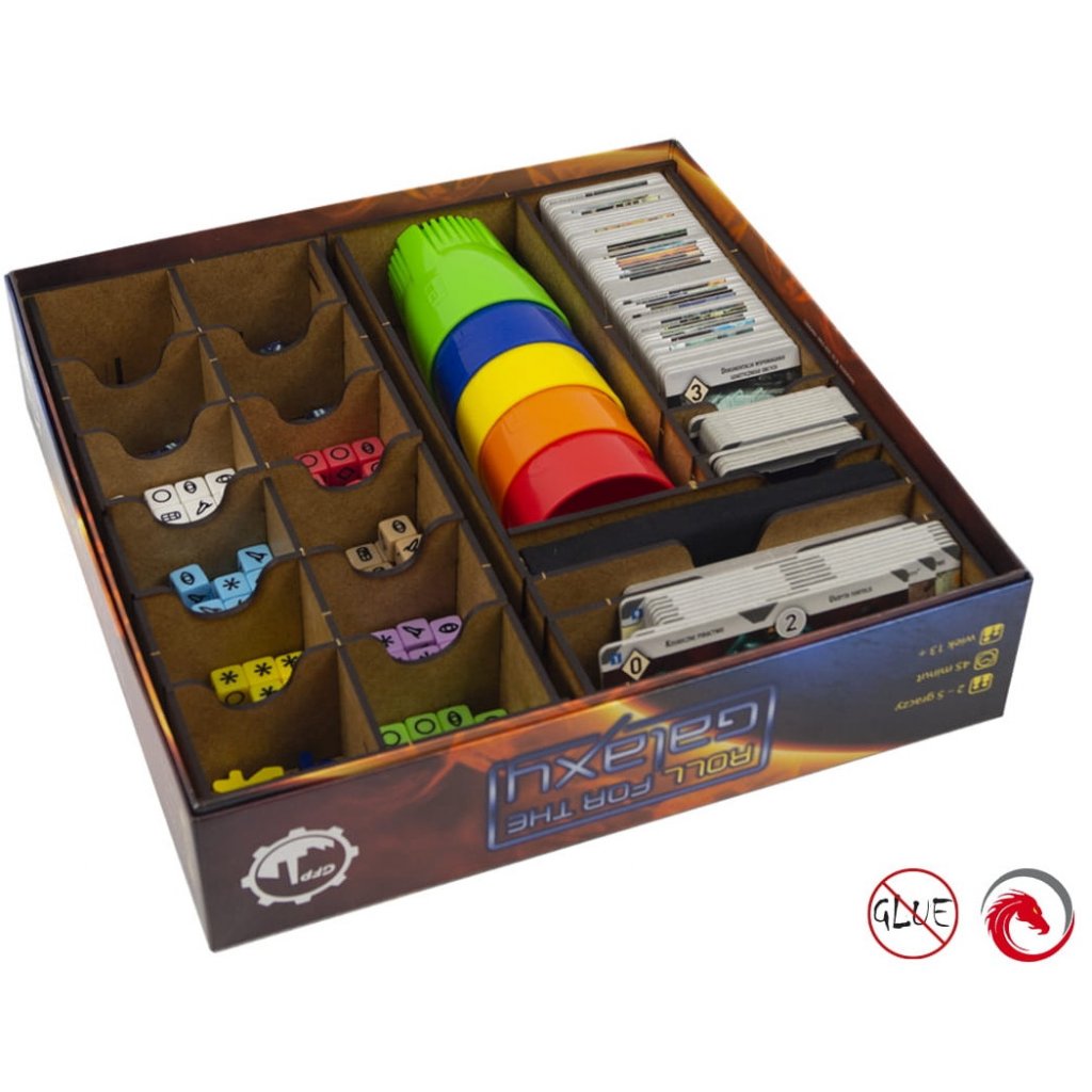 - Dřevěný insert navržený pro základní hru Roll for the Galaxy.