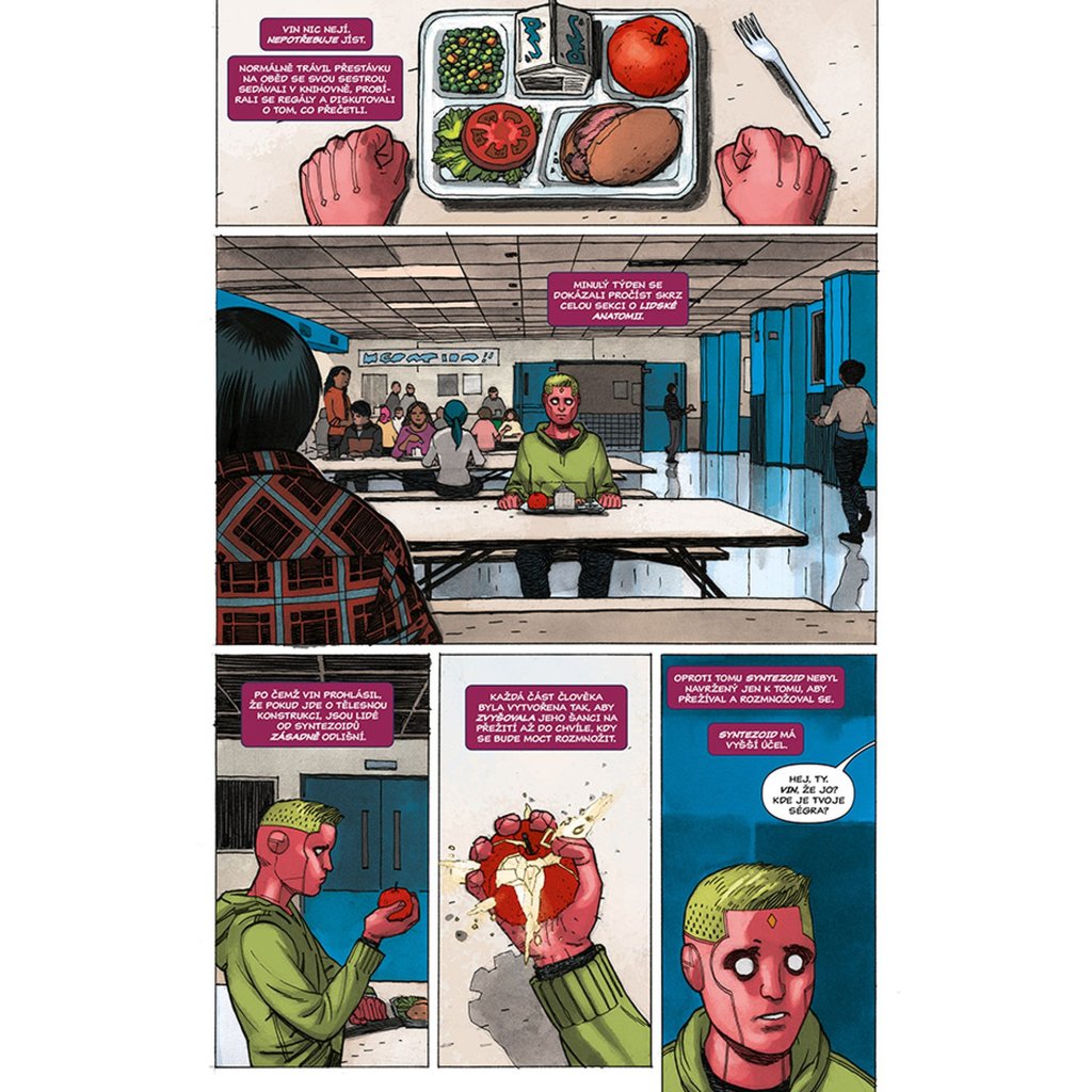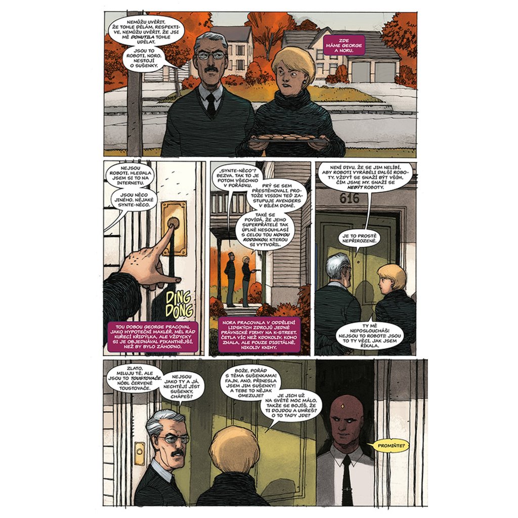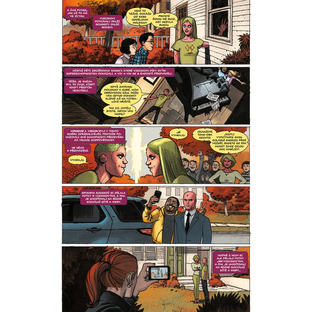 VISION chce být jako člověk, a co je víc lidského než rodina? Proto se vrací zpátky tam, kde to všechno začalo. Do laboratoře, kde mu dal Ultron život a přeměnil jej ve zbraň. Do místa, kde se poprvé vzepřel předurčenému osudu a uvědomil si, že by mohl být něčím víc – že by mohl být člověkem. Právě zde je tedy stvořil. Virginii, manželku. Viv a Vina, dvojčata v pubertě. Vypadají jako on. Mají i stejné superschopnosti. A sdílí také jeho největší touhu (nebo je to posedlost?): neutuchající potřebu být zcela obyčejnými lidmi. Jsou to prostě jen sousedi odvedle, akorát nás můžou kdykoliv všechny zabít. Tak žádné obavy, vždyť co by se mohlo stát? Připravte se na zlomená umělá srdce, těla, která nezůstanou pohřbena, pravdu, jež bude odhalena... a na Visiona, který se navždycky změní.