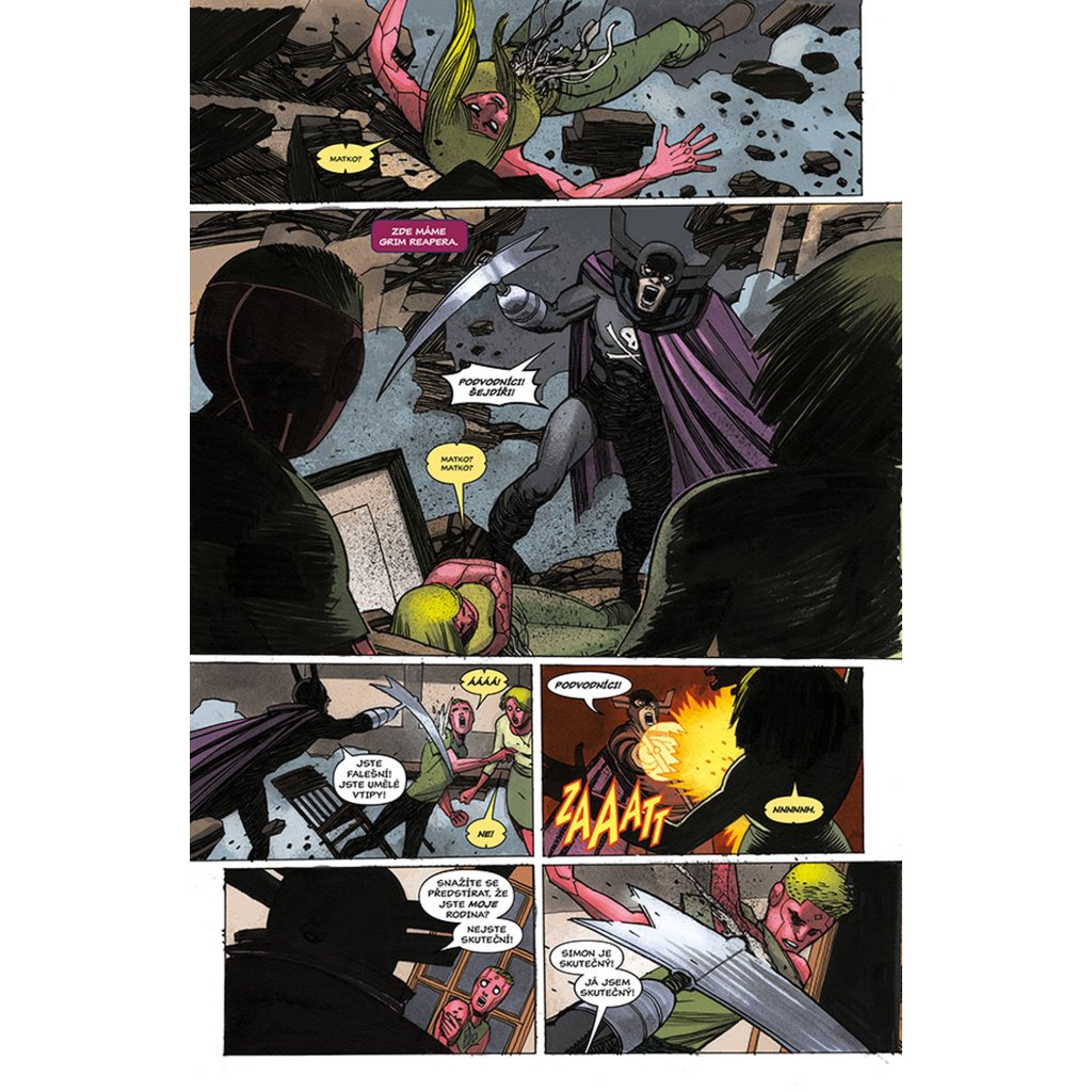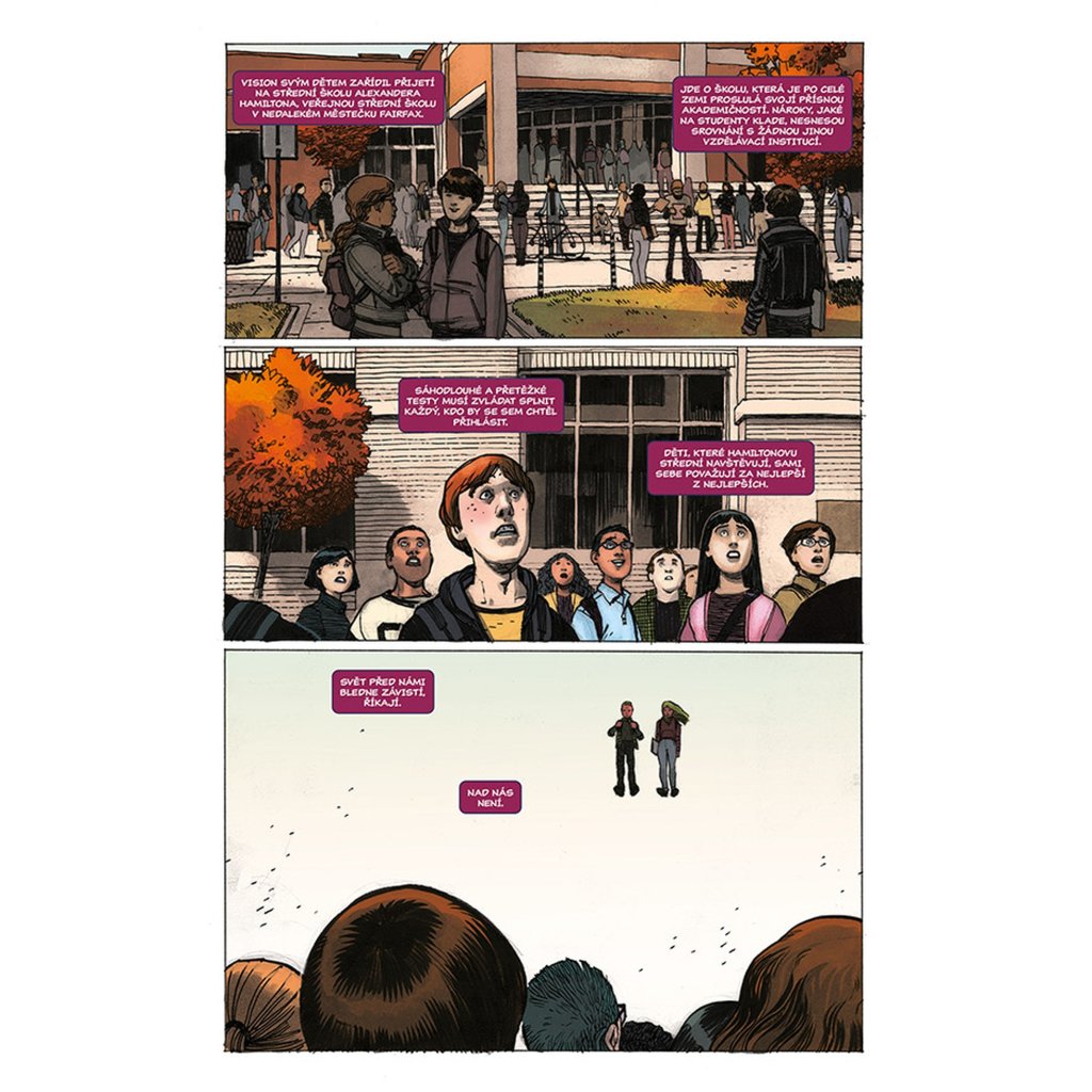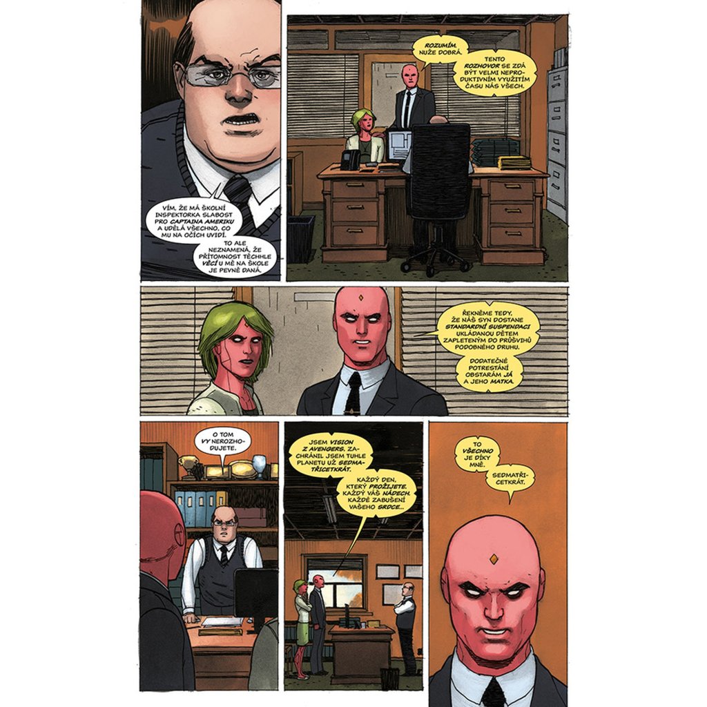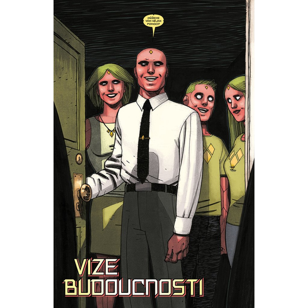 VISION chce být jako člověk, a co je víc lidského než rodina? Proto se vrací zpátky tam, kde to všechno začalo. Do laboratoře, kde mu dal Ultron život a přeměnil jej ve zbraň. Do místa, kde se poprvé vzepřel předurčenému osudu a uvědomil si, že by mohl být něčím víc – že by mohl být člověkem. Právě zde je tedy stvořil. Virginii, manželku. Viv a Vina, dvojčata v pubertě. Vypadají jako on. Mají i stejné superschopnosti. A sdílí také jeho největší touhu (nebo je to posedlost?): neutuchající potřebu být zcela obyčejnými lidmi. Jsou to prostě jen sousedi odvedle, akorát nás můžou kdykoliv všechny zabít. Tak žádné obavy, vždyť co by se mohlo stát? Připravte se na zlomená umělá srdce, těla, která nezůstanou pohřbena, pravdu, jež bude odhalena... a na Visiona, který se navždycky změní.