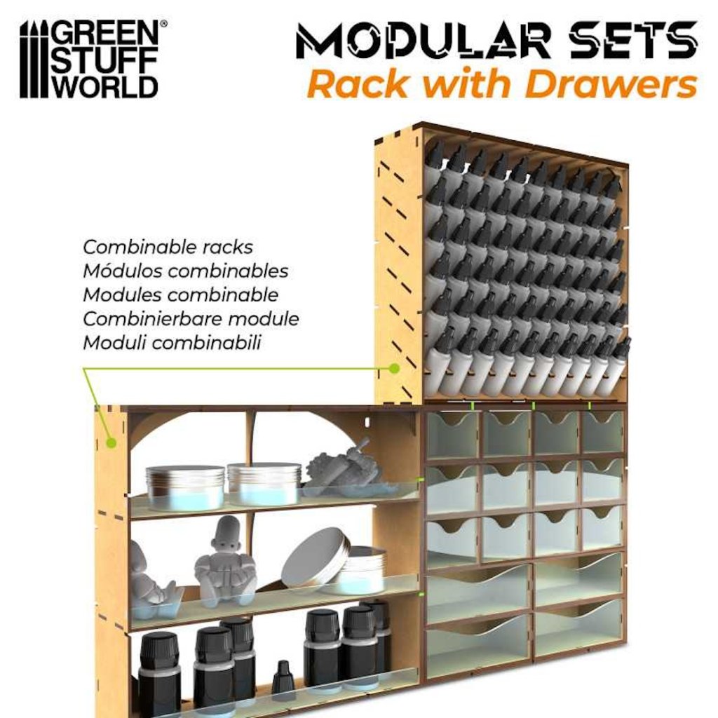 - MDF Vertical rack with Drawers je sada zásuvek z MDF dřeva, ideální pro kombinaci s našimi modulárními stojany na barvy, což vám umožní efektivně organizovat váš pracovní prostor.