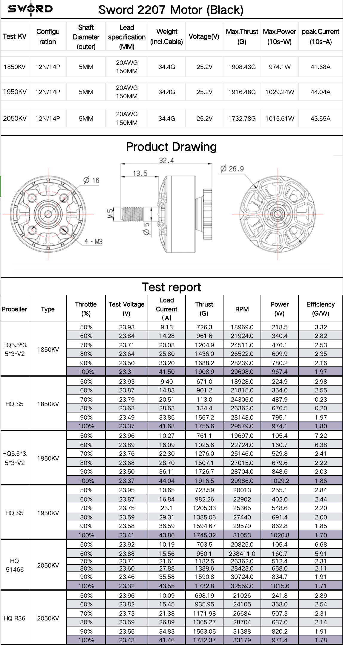 - Zvon motoru je vyroben z odolné slitiny 7075, použité jsou kvalitní NMB ložiska, N52HS oblé magnety a teplotně odolné vinutí až do teploty 220°C.