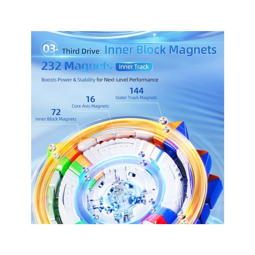 - Systém Triple-Track magnetického zarovnání zajišťuje přesné dosedání vrstev ve třech osách zároveň, takže kostka se při skládání chová předvídatelně a stabilně.