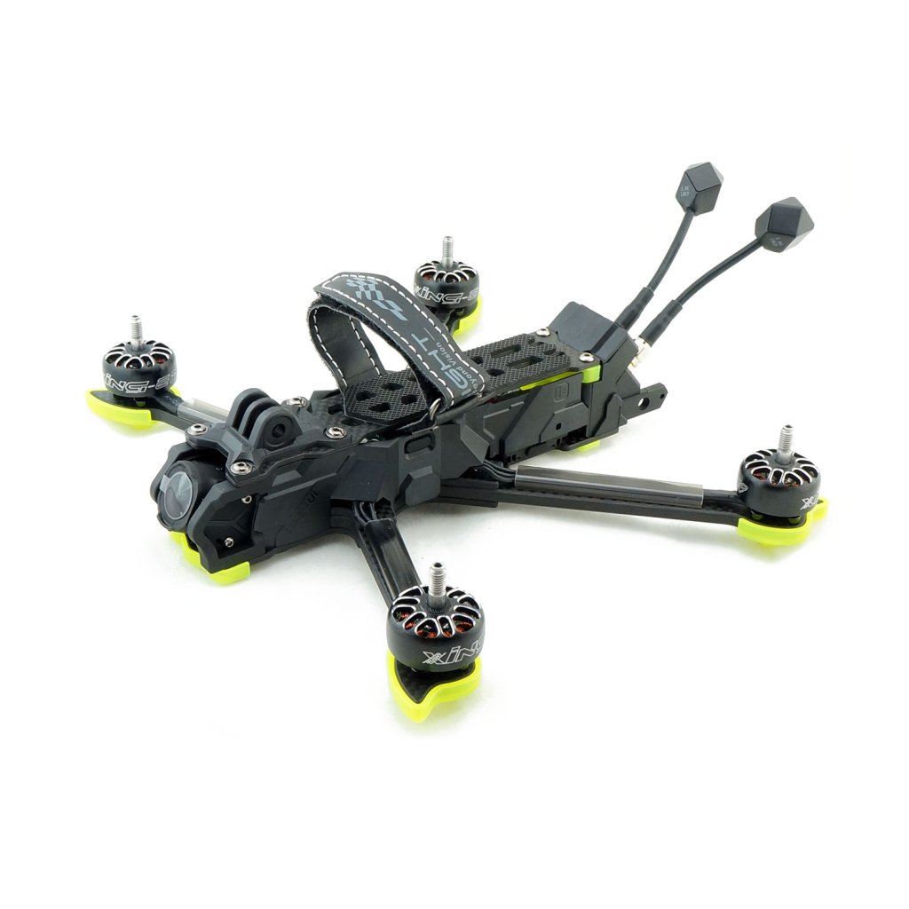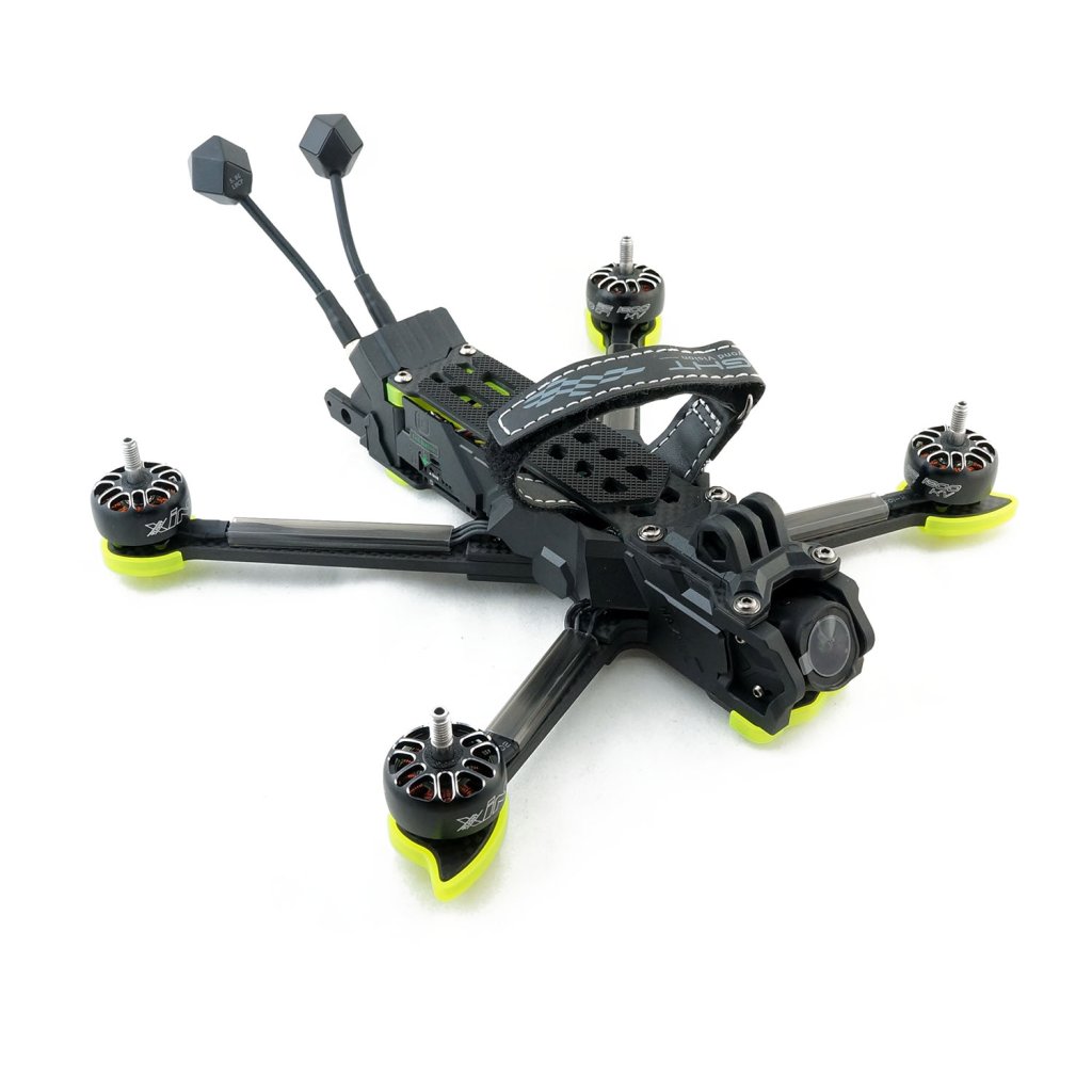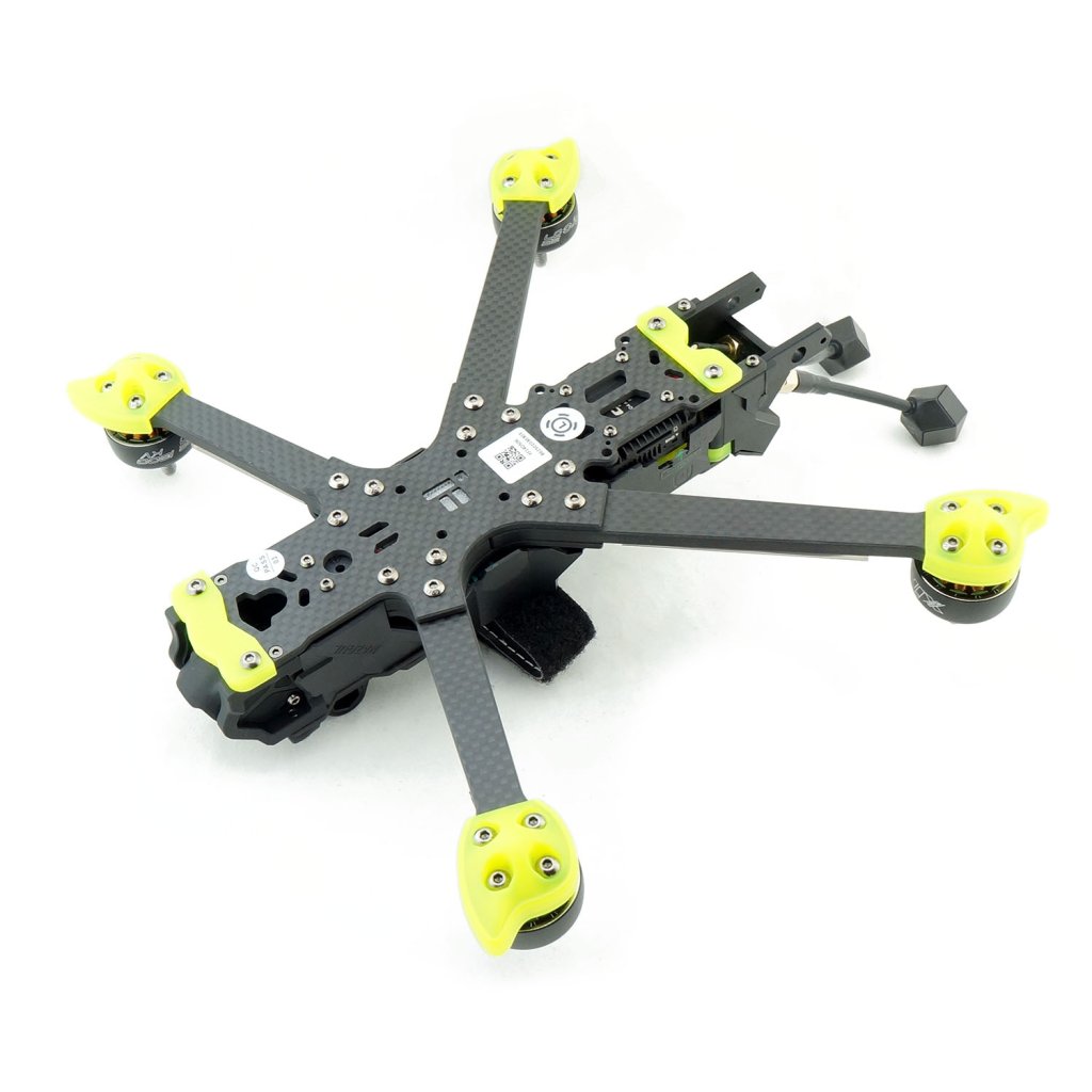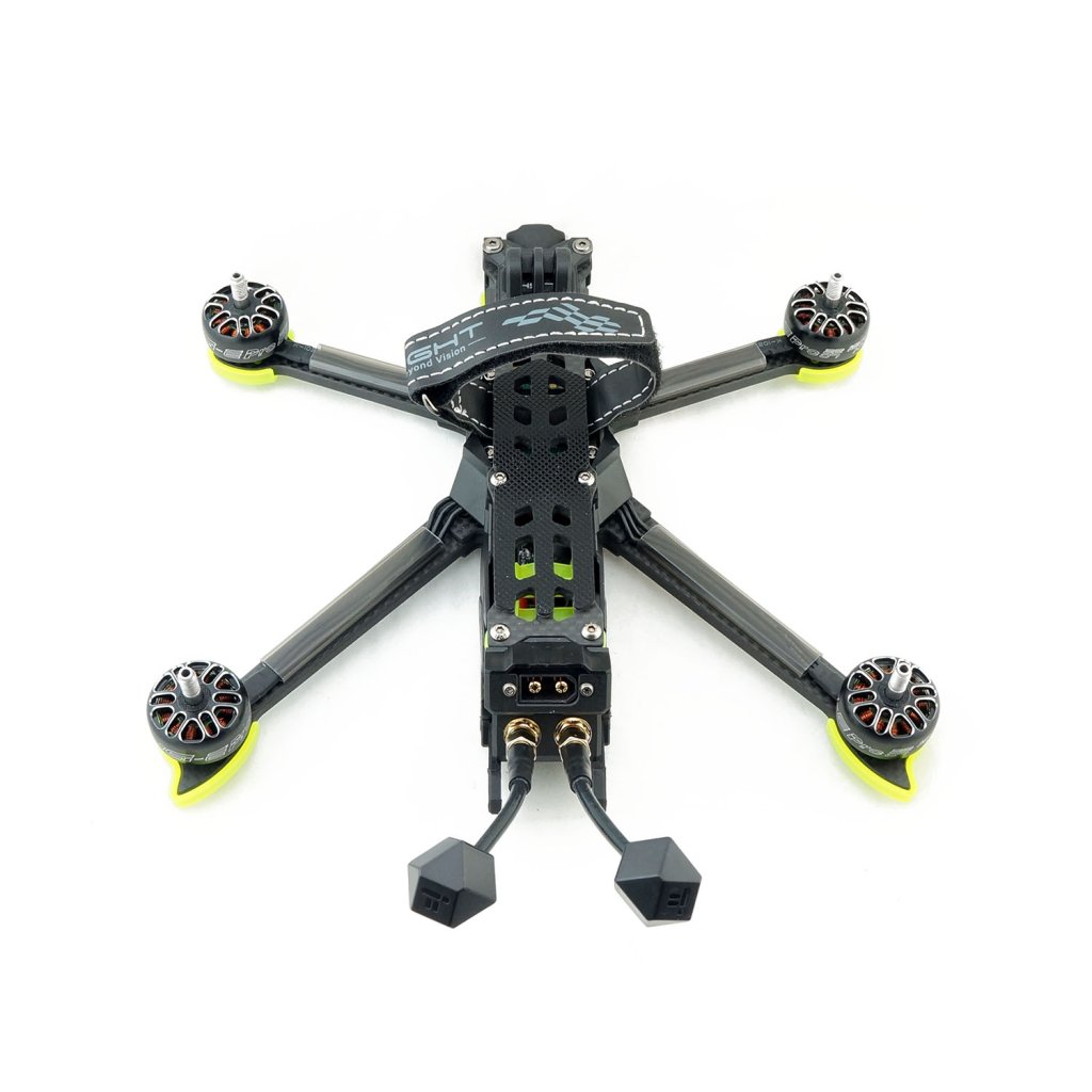 - Odolná konstrukce kombinující karbonový rám a hliníkový držák kamery zajišťuje pevnost a přesnost uchycení při zachování nízké hmotnosti. Model je navržen tak, aby ve videu nebyly vidět vrtule, což zvyšuje estetiku leteckých záběrů, a dodávaný držák na GoPro umožňuje rozšířit kreativní možnosti. Elektronika je chráněna obvodem proti jiskření, který prodlužuje životnost konektorů XT60 a chrání systém před napěťovými špičkami.