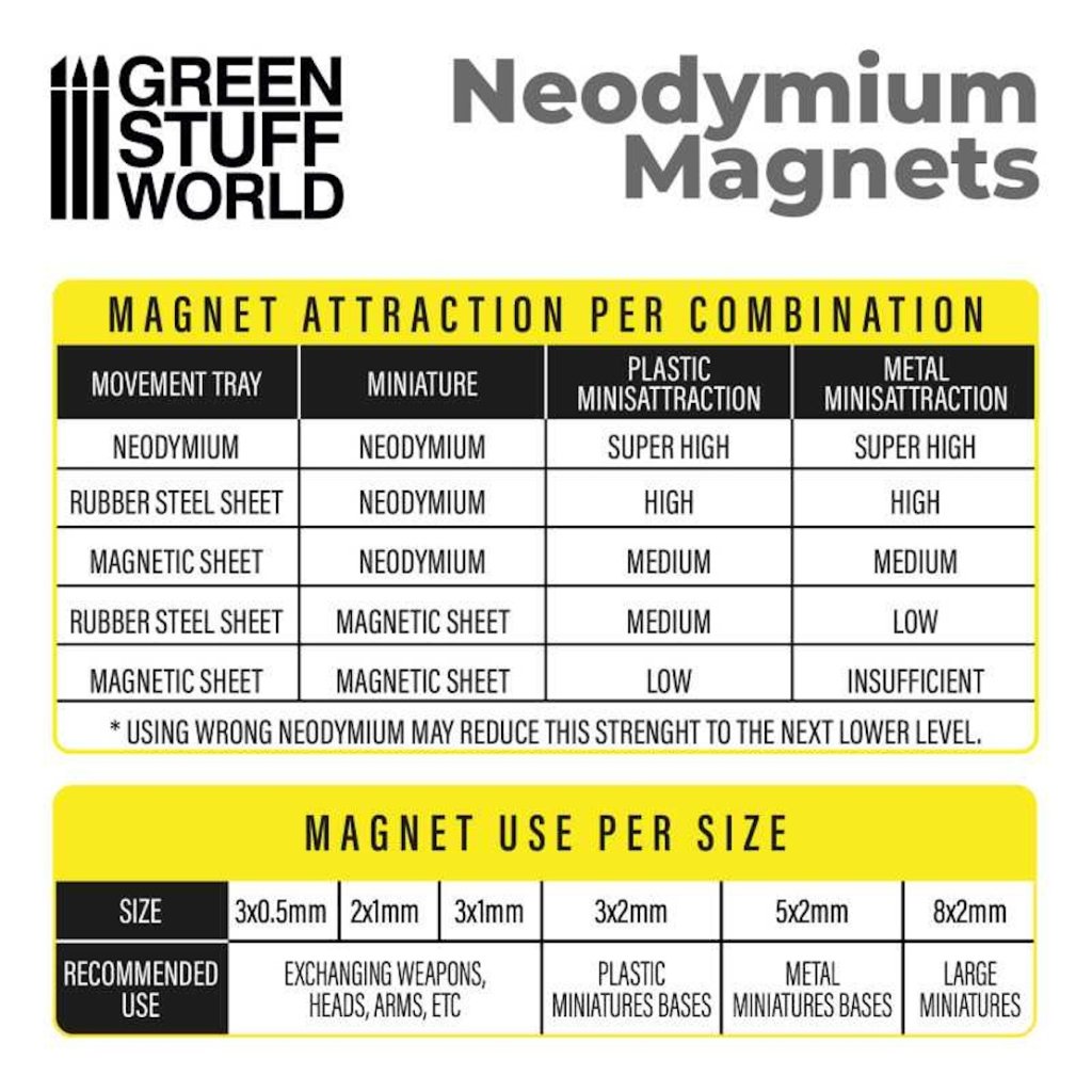 - Neodymium Magnets 3x0.5mm - 50 units (N52) od Green Stuff World (GSW): Silné neodymové magnety o průměru 3 mm a tloušťce 0,5 mm. Balení obsahuje 50 kusů s magnetizací N52.