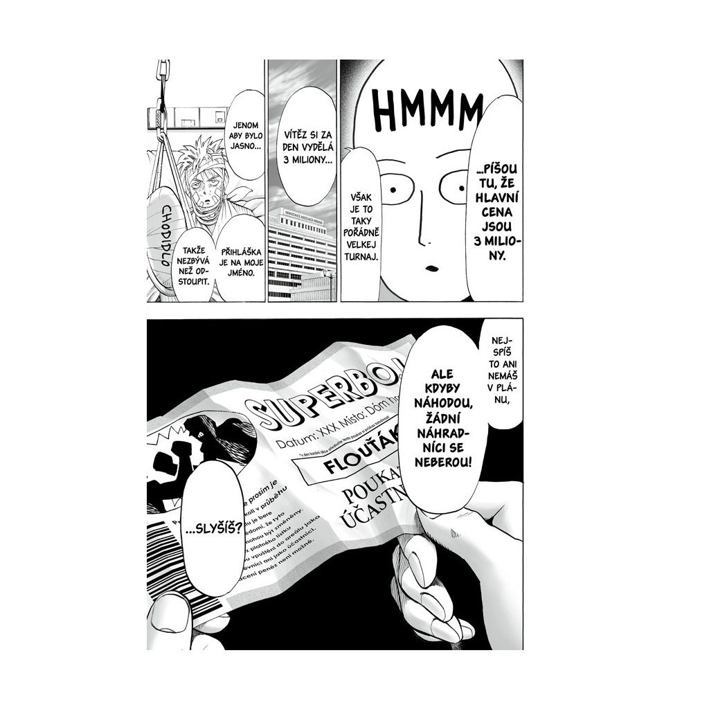 Garó, lidská příšera, zintenzivňuje svůj „hon na hrdiny“. Napáchané škody se zvětšují, nervozita v hrdinské branži roste, ale Saitamu zatím zaujmou bojová umění a rozhodne se tajně zúčastnit turnaje.