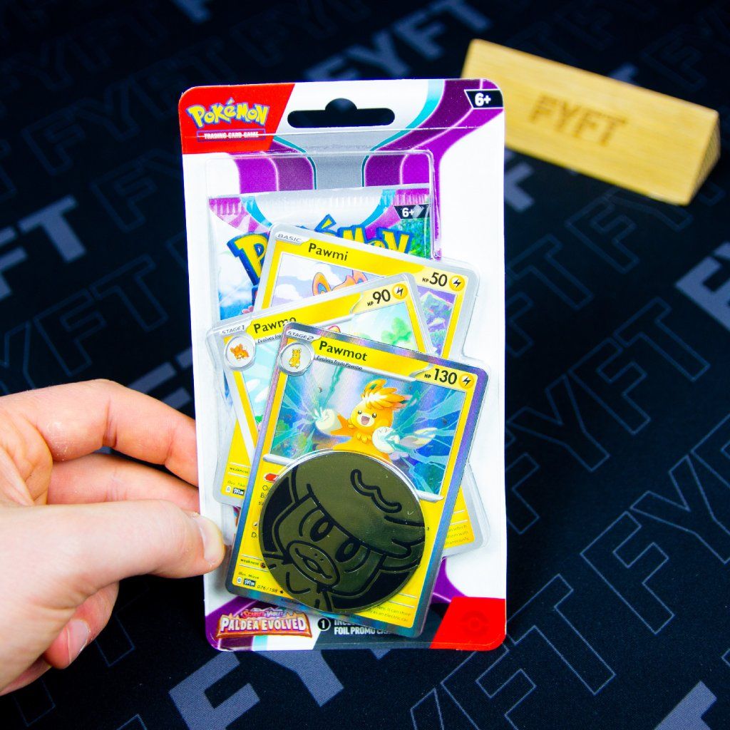 - Premium Checklane Booster obsahuje 1 booster pack s 10 náhodně namíchaných karet, 3 promo karty s celou evoluční linií Pawmi, Pawmo a Pawmot a minci z edice Paldea Evolved.