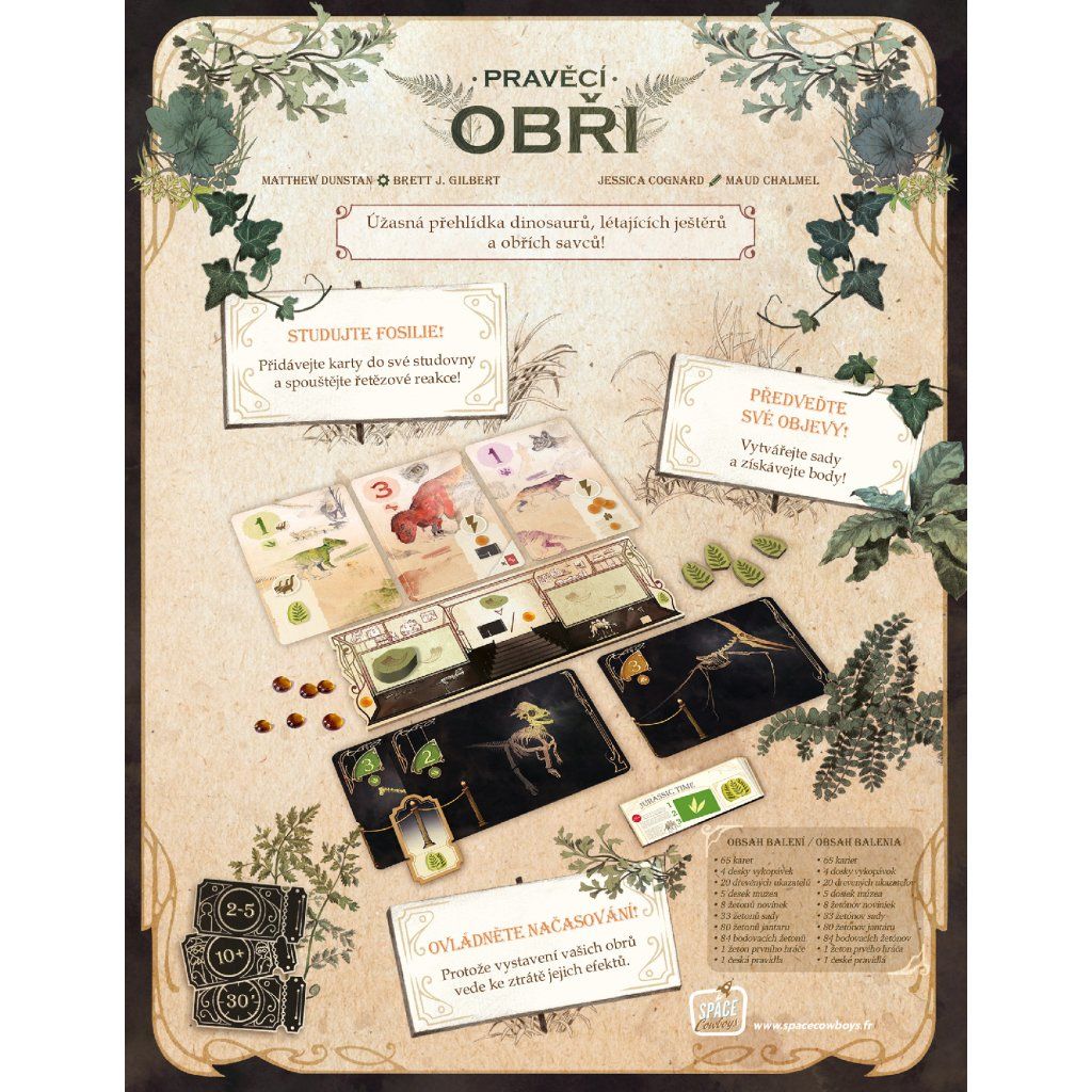 - Obsah balení: 65 karet, 4 desky výhledů, 20 dřevěných ukazatelů, 5 desek muzea, 8 desek novinek, 33 žetonů sady, 80 žetonů jantaru, 84 bodovacích žetonů, 1 žeton prvního hráče, česká pravidla