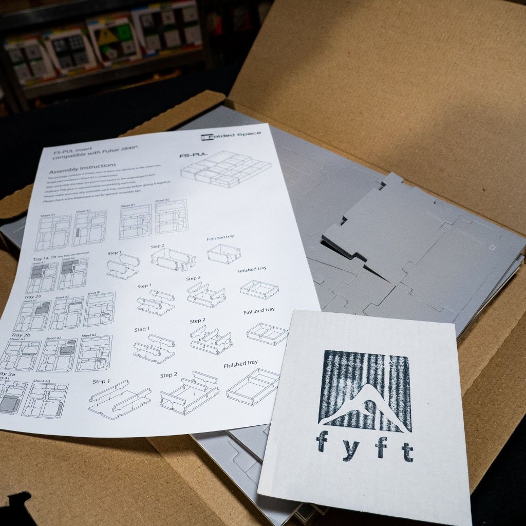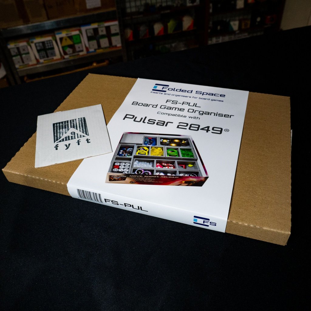 This Campaign 3 insert is designed to be compatible with Pulsar 2849®. The design provides both efficient storage and improved game play. The trays can be utilised during the game, and they greatly aid set-up and clear-away times. The rules and boards act as a lid on top of the trays. With the top layer removed you can see the second layer of trays underneath. The insert includes separate trays for each of the colour player pieces, with separate slots for the card and plastic components. The other trays are for the gyrodyne tiles, and the engineering cubes, four-cube tokens and other tokens. When packing the game into the box with the insert, the HQ boards and goal tiles go as shown here, on top of the trays below, in a recess made for them. The game board is then placed on top. This is kept in place by the square filler tray in the top left corner. Note that while some trays can be seen below the board, these are for the large transmitter tiles, which cannot come out with the board positioned in this way. On top of the board go the rules, and then the remaining curved boards as shown. With all the components placed in the box as shown and the lid kept on, the box can be stored vertically. This product consists of a flat-pack of 4 Evacore sheets. The trays require assembly, which is quick and fun, using ordinary PVA glue. Detailed instructions are included in the package.