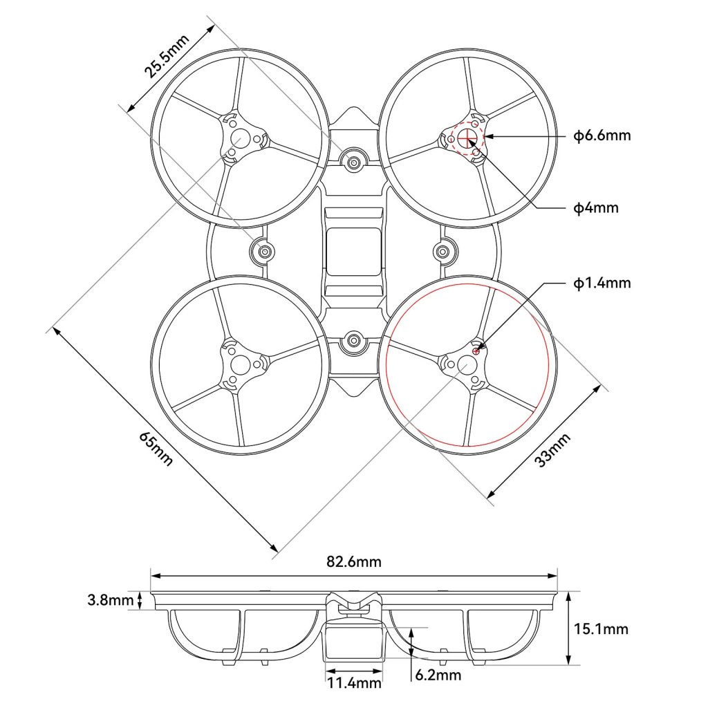- Rám obsahuje praktické detaily jako rozšířené montážní otvory 25,5 × 25,5 mm, přesné drážky pro usazení motorů a ochranu motorových šroubů. Slot pro baterii má rozměr 11,4 × 6,2 mm a celkové rozměry rámu jsou 82,6 × 82,6 × 15,1 mm.