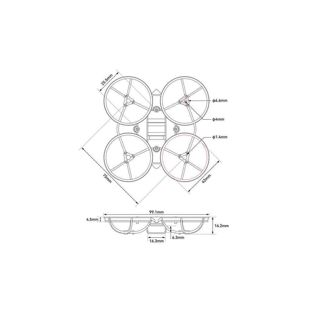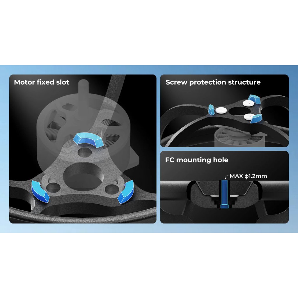 - Mezi praktické prvky patří motorové sloty s ochranou šroubů, zvětšené montážní otvory 25,5 × 25,5 mm a prostor pro baterii 16,3 × 6,3 mm. Celkové rozměry rámu jsou 99,1 × 99,1 × 16,2 mm.