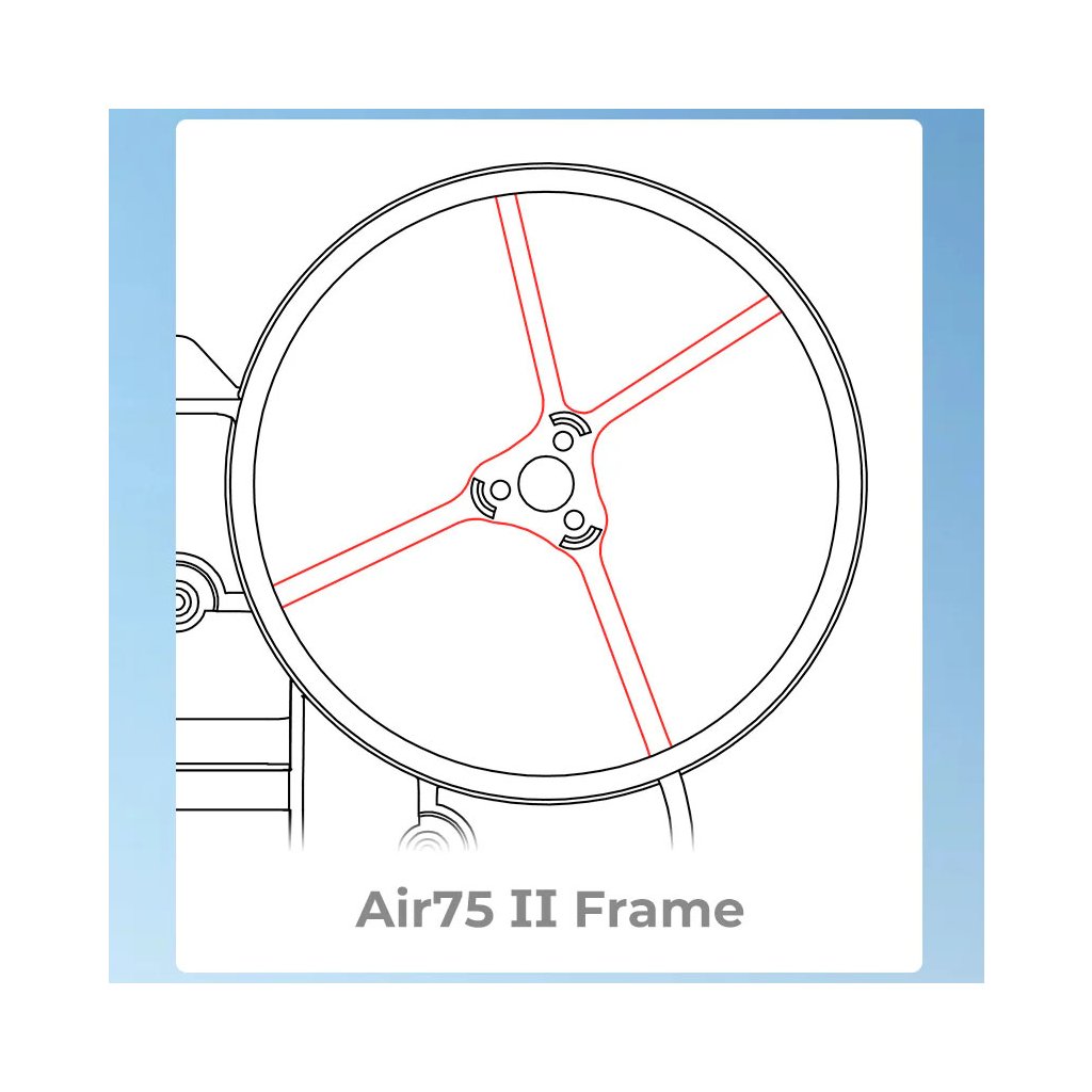 - Air75 II Brushless Whoop Frame je odlehčený rám pro 1S a 2S whoopy s roztečí motorů 75 mm, který oproti první generaci nabízí o 10 % nižší hmotnost – pouhé 4 g. Nová konstrukce se 4 výztuhami ramen místo šesti a optimalizovaná geometrie ductů zvyšují pevnost, snižují odpor vzduchu a zlepšují celkové letové vlastnosti.