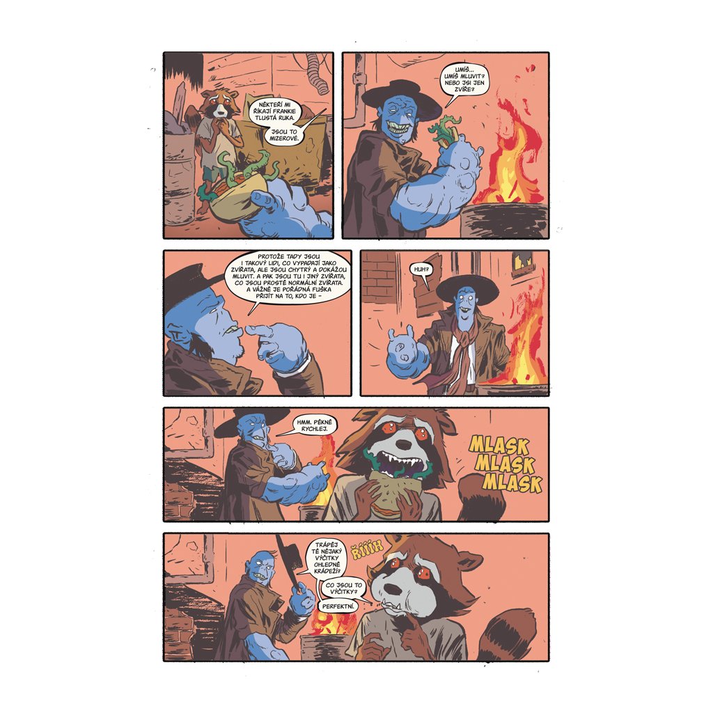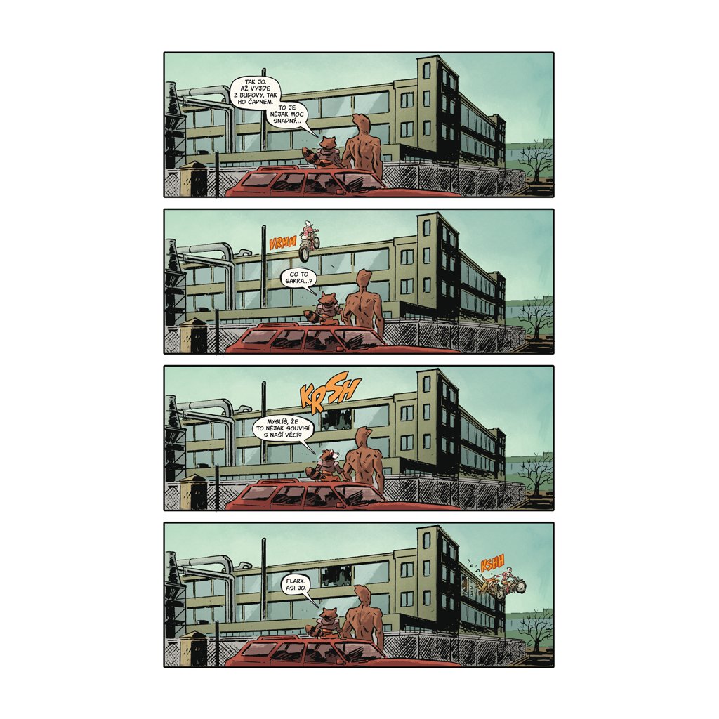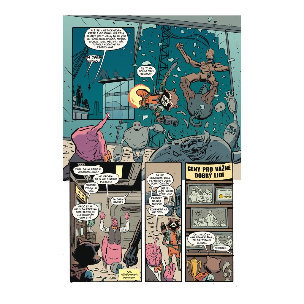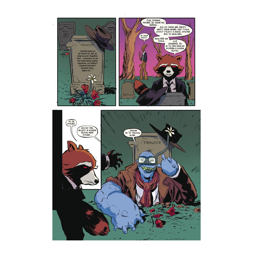 Rocket a Groot se dokážou zabavit i v márnici. Jenže ani ta největší zábava nedokáže zakrýt smutek jistého mývala nad smrtí svého učitele podfukářství.