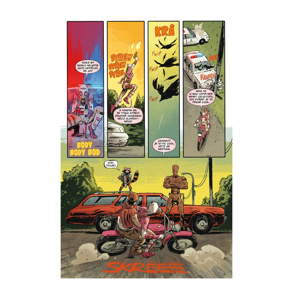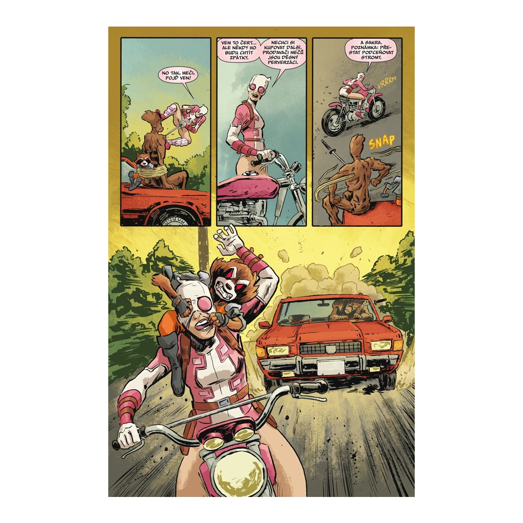 Začíná nová éra oblíbené dvojice Strážců galaxie, a to hned pohledem do Rocketovy tajemné minulosti. Pak se však naši hrdinové ocitnou ve víru druhé Občanské války. Ale klídek, ani tohle nedokáže naše nerozlučné přátele rozdělit, zvláště pak, když je více zajímá chystaná krádež v továrně na dětský pudr kdesi v Georgii. Proč je to tak zajímá… a proč se do toho motá i podivná a neuvěřitelná Gwenpool? Ano, na venkovských silnicích dojde k nelítostnému klání profesionálních lovců hlav! Odměna bude vysoká, ale rizika také! A budou lítat třísky… a to nejen z Groota!