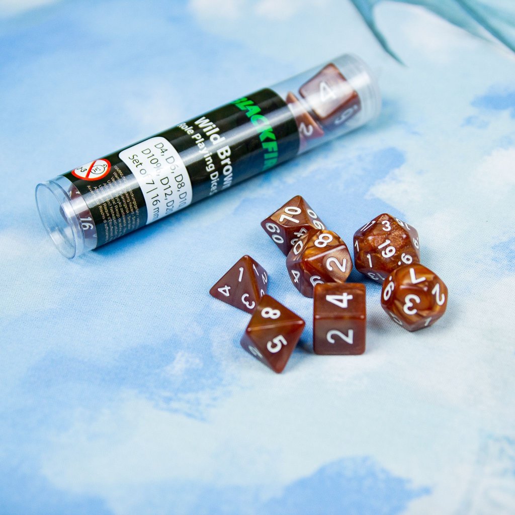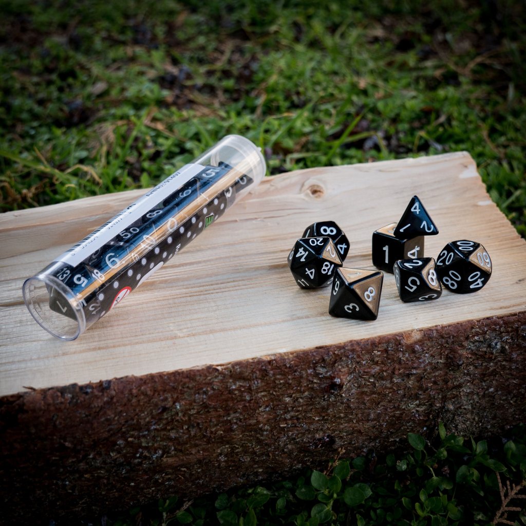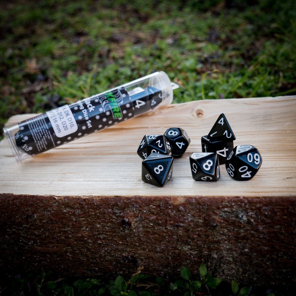 - Kostky: D4, D6, D8, D10, D12, D20, D10% (7 kostek)