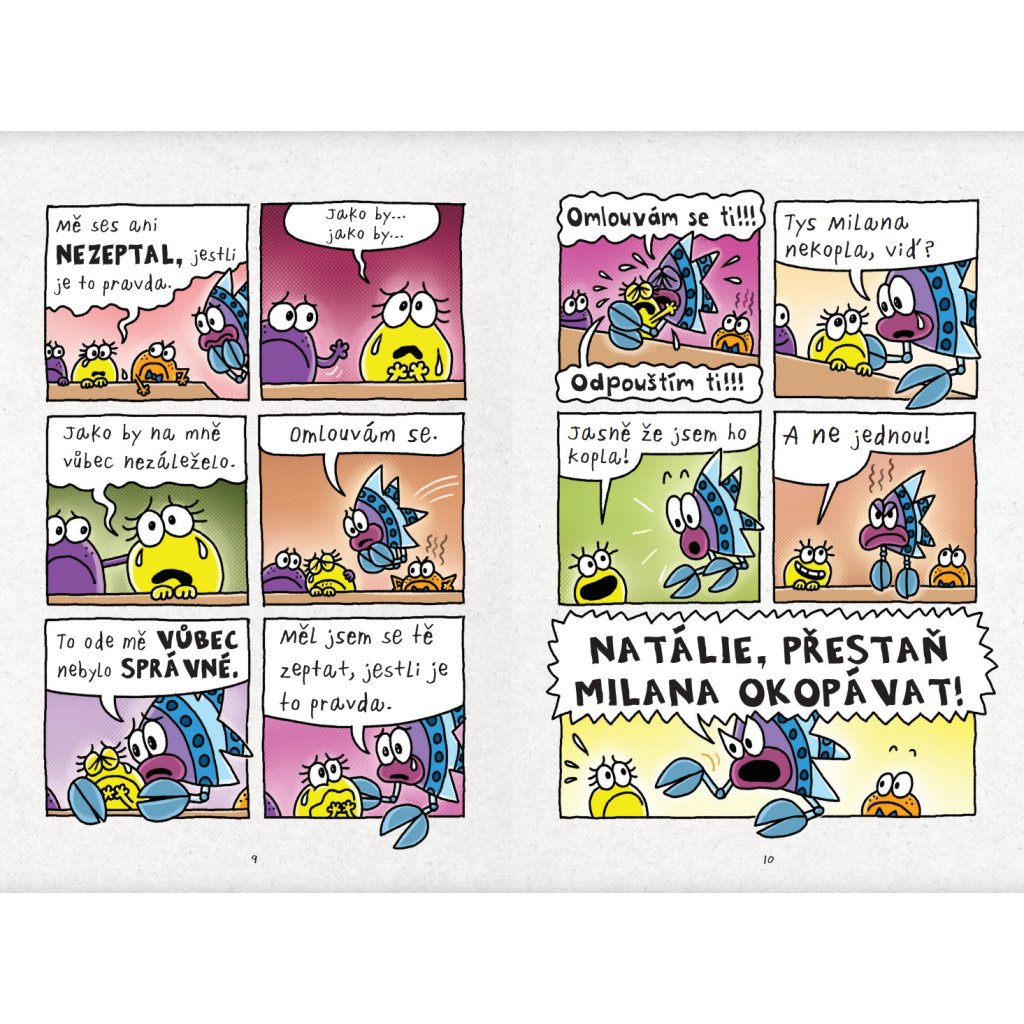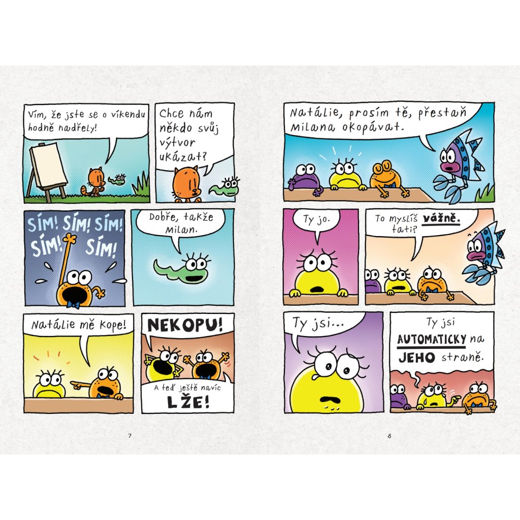 Jak dopadne druhý týden komiksové školy? Každá žába má co říct! Jenže spoustu času proflákají hádáním. Hlavně Milan s Natálií si jdou po krku. Zvládnou vyrobit nové komiksy a k tomu se udobřit? A podívat se třeba na věc i z jiné perspektivy? Totiž z perspektivy toho druhého? Ale nebojte – nečeká vás žádné poučování, jenom čistá zábava! Tolik očekávané žabiččí komiksy jsou tady – Vazoun McPavoučí zadek, Oliheňka a sarančátko, Žabičkové komando, Megapackal 2 a mnoho a mnoho dalšího!