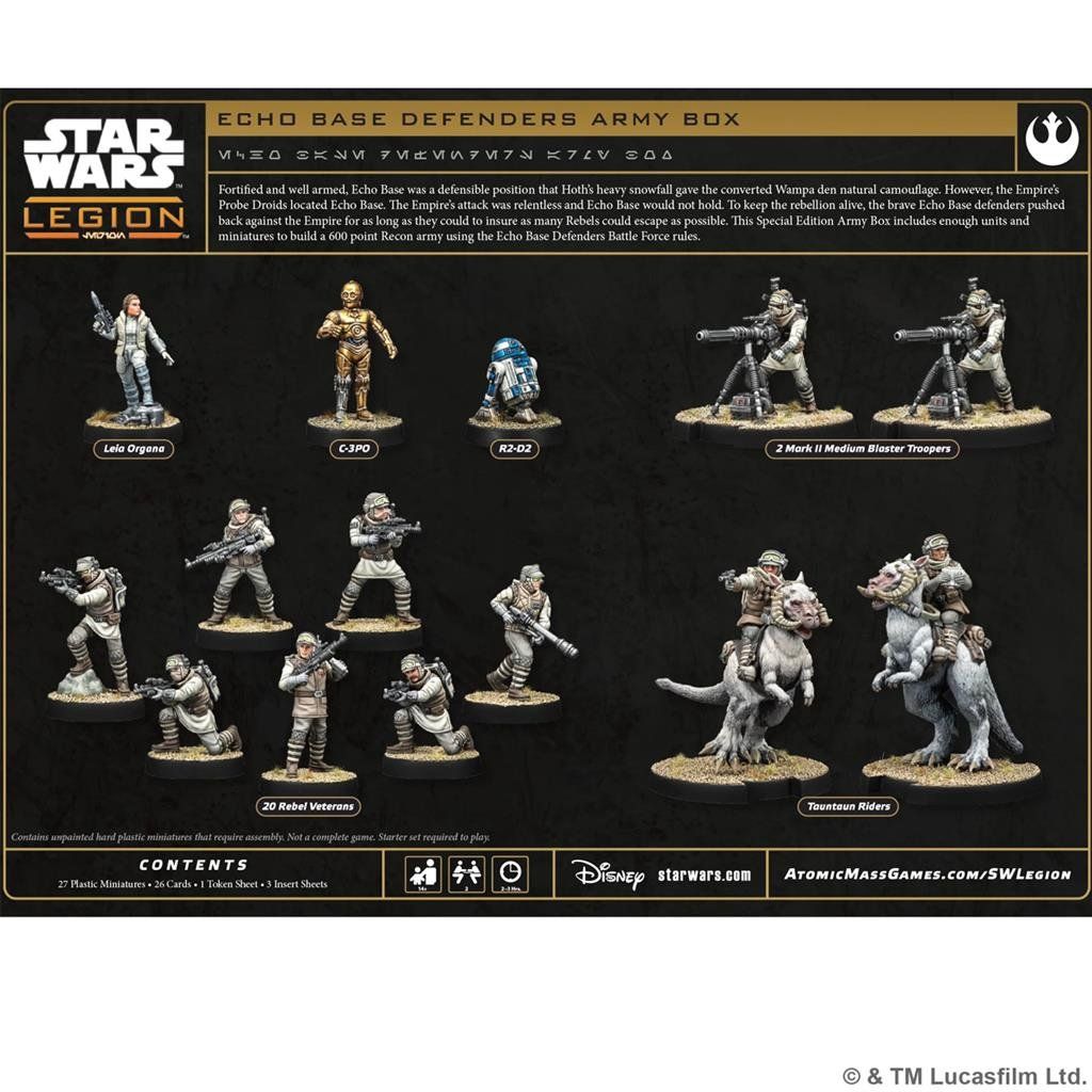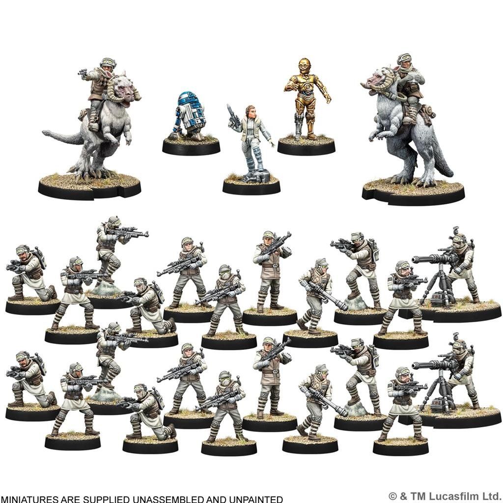- Obsah: 1 miniatura Leiy Organy (exkluzivní sculpt), 1 miniatura C-3PO, 1 miniatura R2-D2, 2 miniatury Mark II Medium Blaster Trooper, 2 miniatury Tauntaun Riders, 20 miniatur Rebel Veteran, 26 karet, 1 arch žetonů, 3 vkládací listy