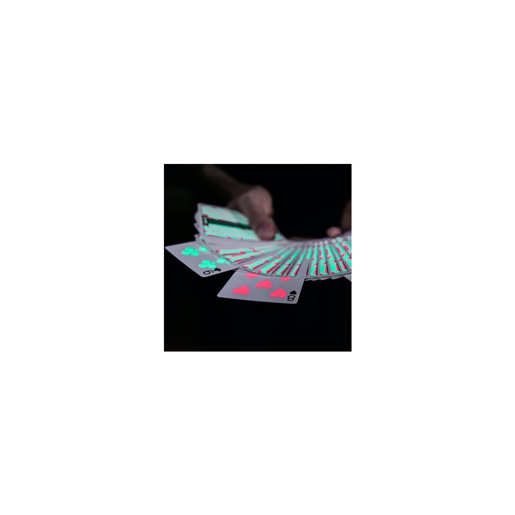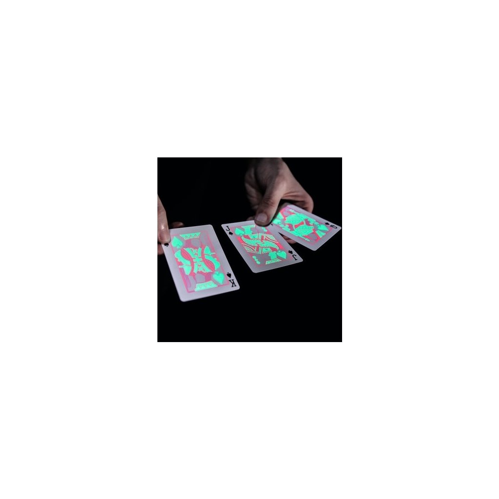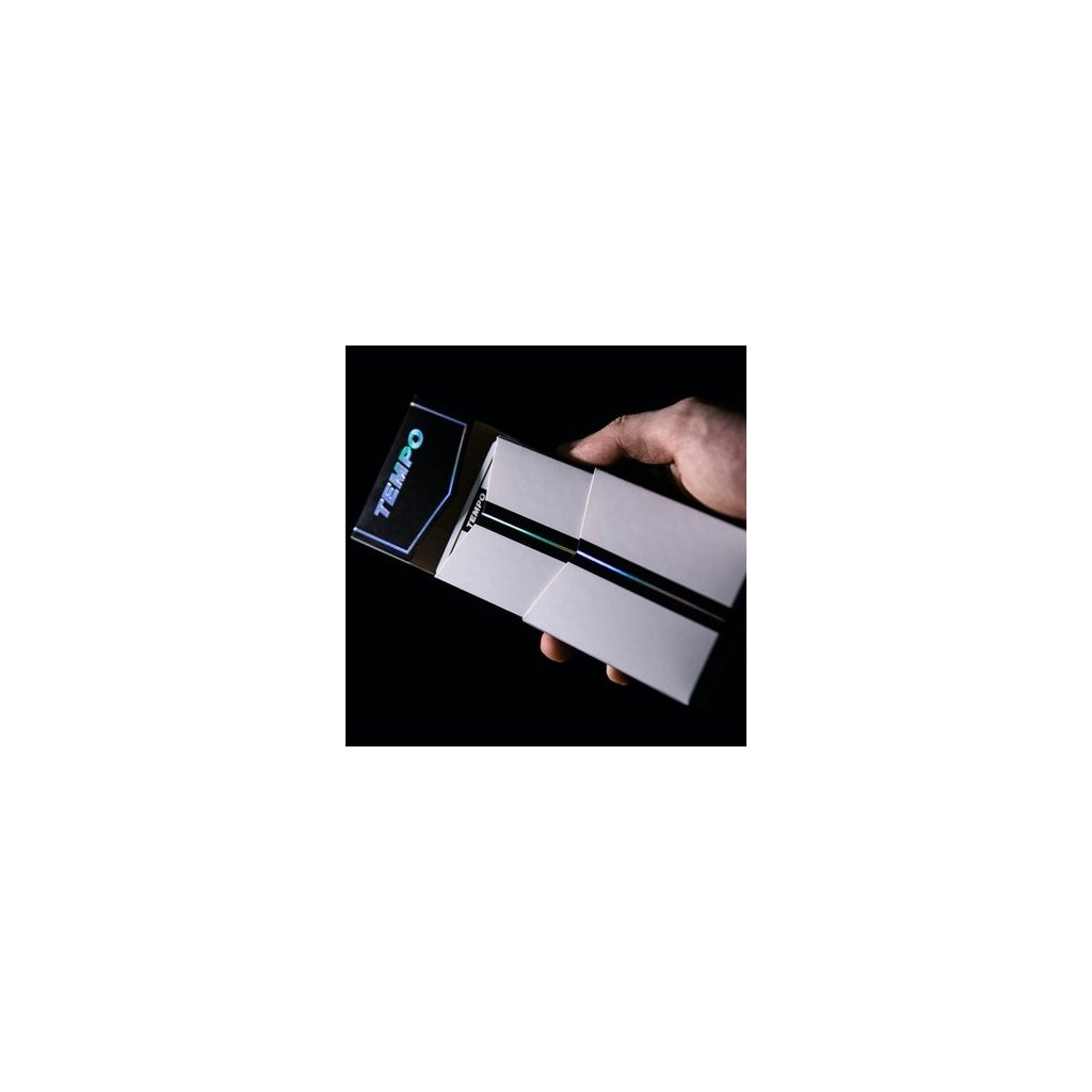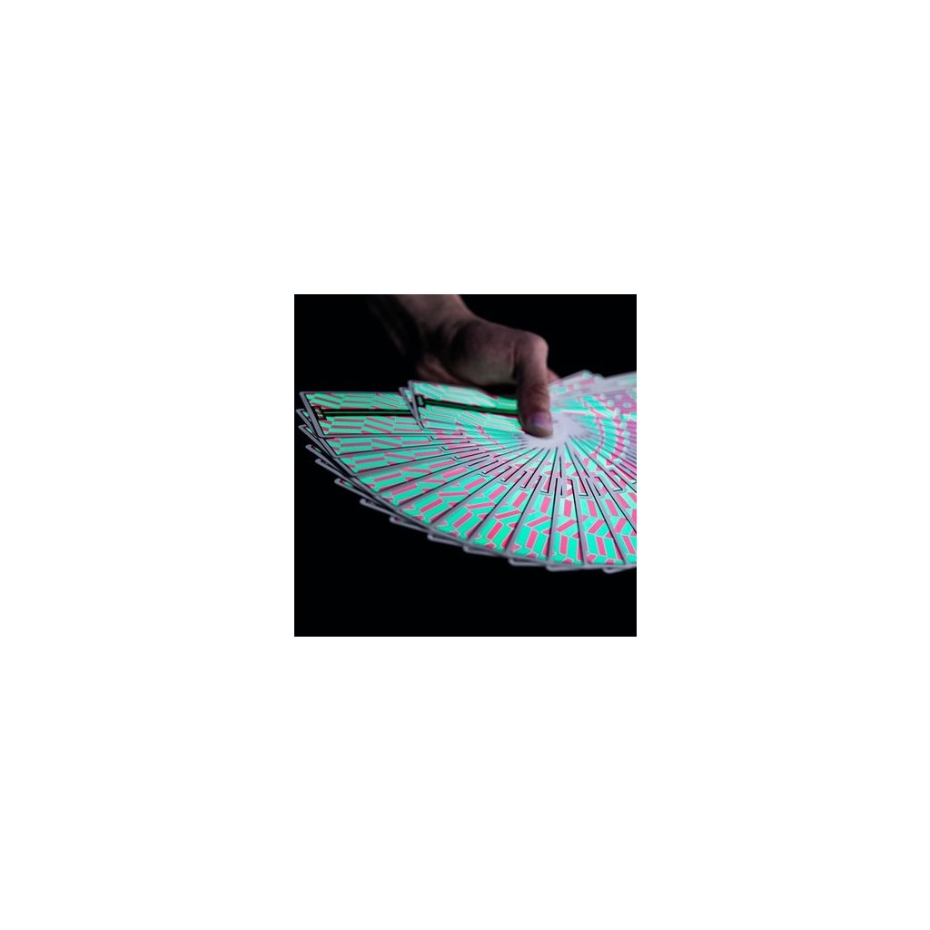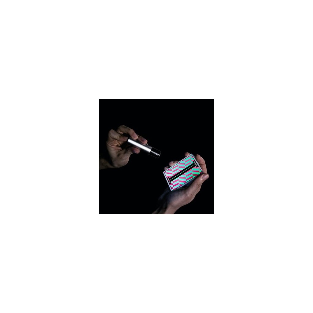 - Karty i krabička vypadá na první pohled černobíle a minimalisticky, pod UV světlem však vyleze opravdový Tempo design. Dokonce i líce karet vypadají prázdně, bez UV světla uvidíš jen rohové indexy, jakmile však použiješ ultrafialové záření objevíš všechny znaky a barvy.