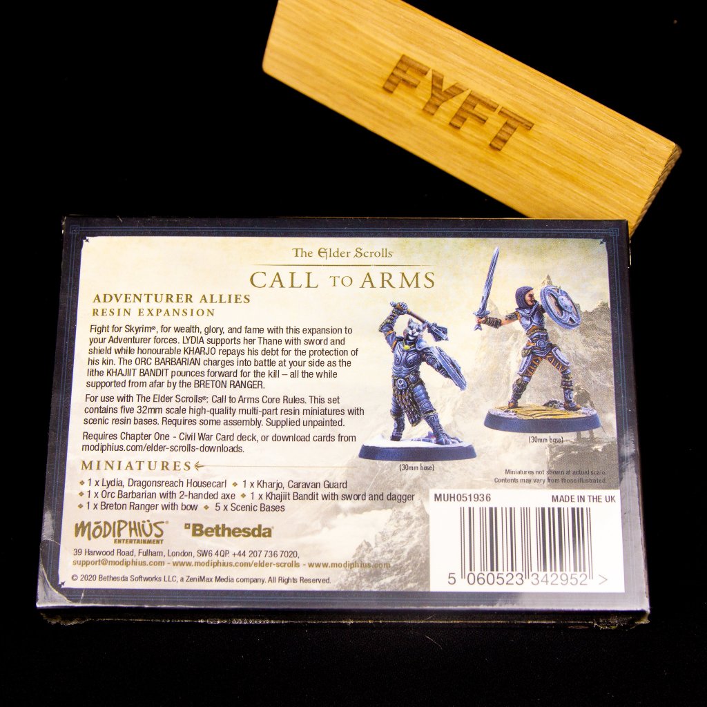 - Rozšíření obsahuje 5 resin miniatur: 1 x Lydia, 1 x Kharjo, 1 x Orc Barbarian with 2-handed axe, 1x Khajiit Bandit with sword and knife, 1x Breton Ranger with bow, 5 x Scenic Bases