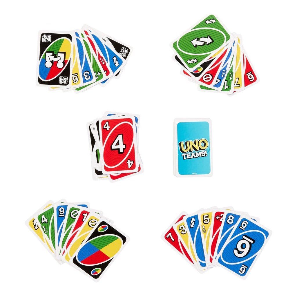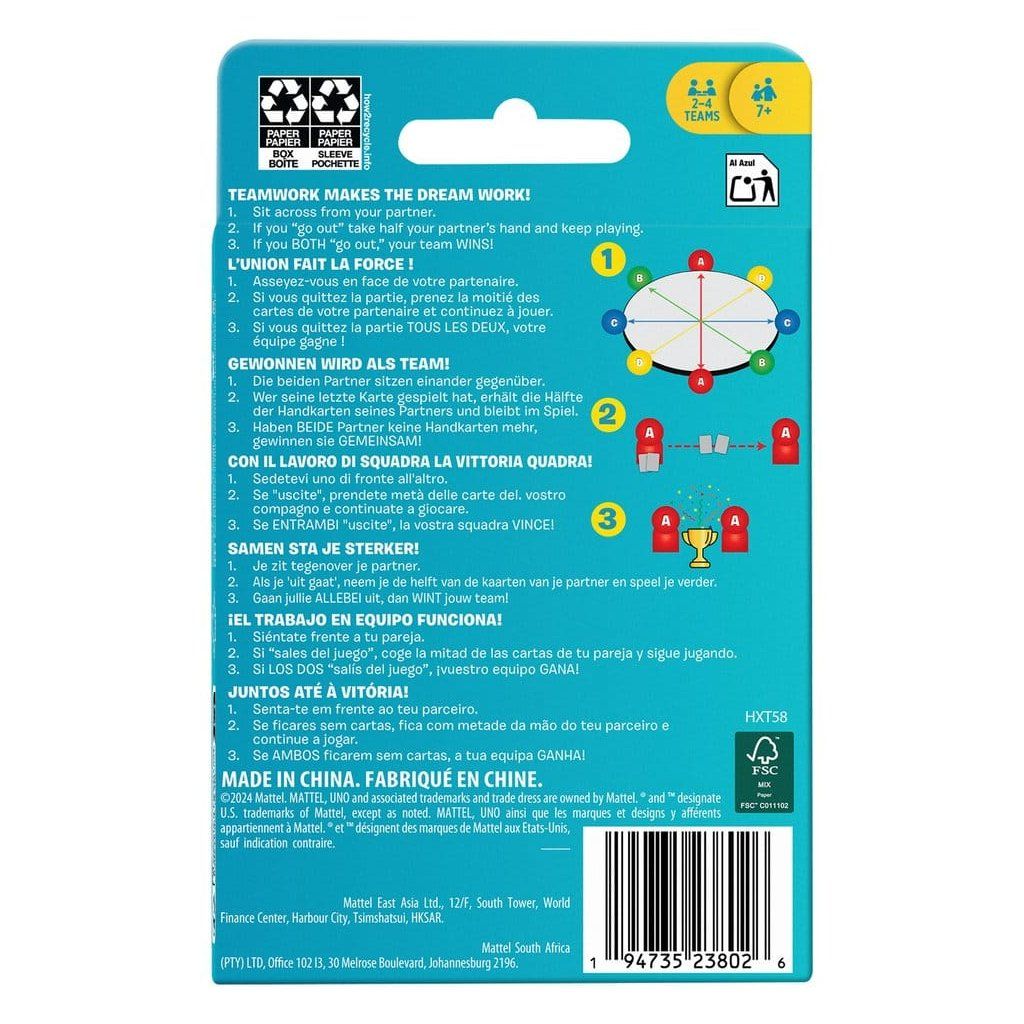 - Hrajete ve dvojicích, takže hra nabízí zcela novou dynamiku oproti klasickému UNO – spolupráce s partnerem přináší nové taktické možnosti.