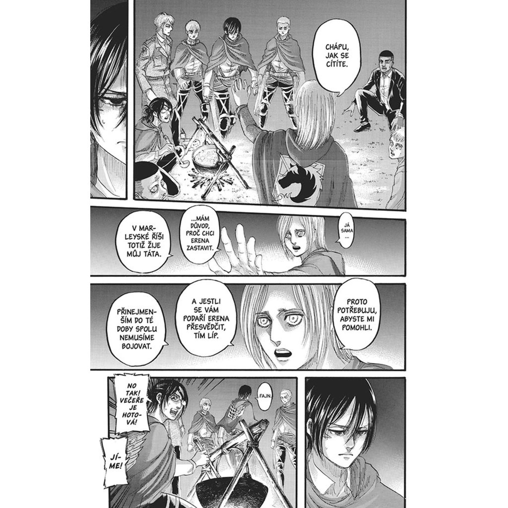 Blíží se okamžik, jenž rozhodne o budoucnosti celého lidstva. Erenovi titáni míří na pevninu, aby zničili veškerý život mimo ostrov Paradis, a bývalým průzkumníkům pod velením Armina a Mikasy mezitím dochází čas...