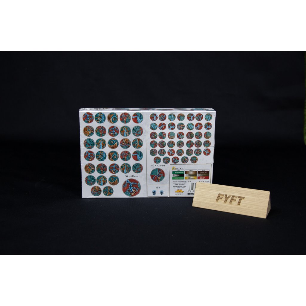 - Sada obsahuje 40 kulatých podstavců o průměru 25mm a 30 kulatých podstavců o průměru 32mm, se strukturou odpovídající deskám Shattered Dominion
